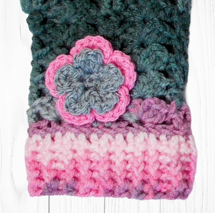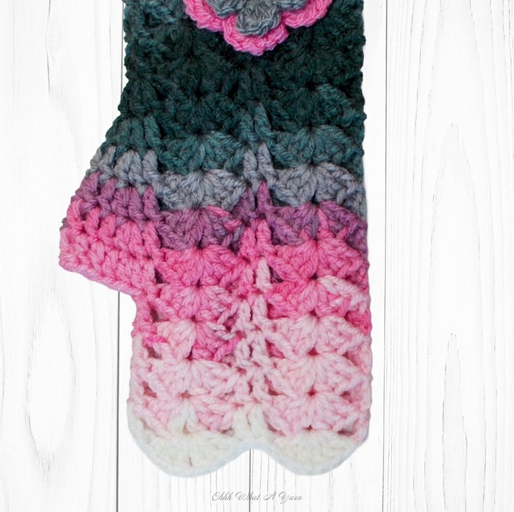 Crocheted using premium 100 % acrylic colour changing yarn in gorgeous shades of pink, grey and white.