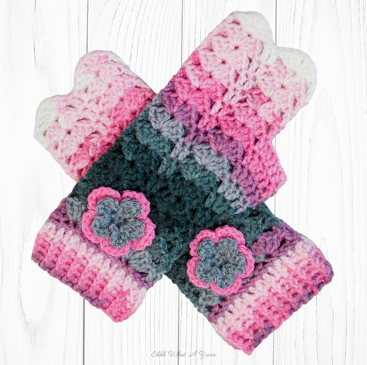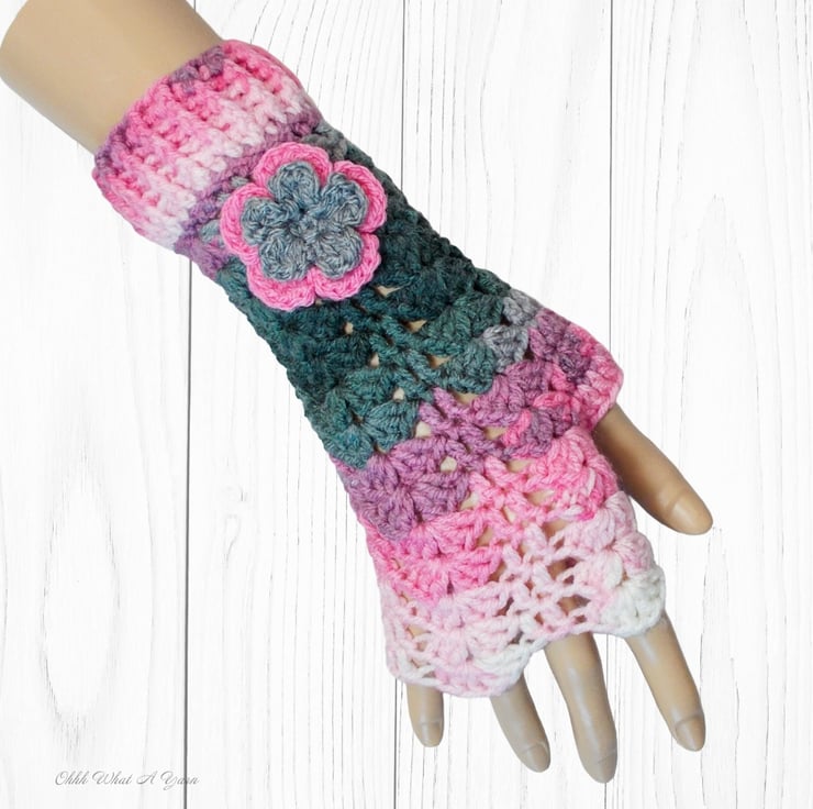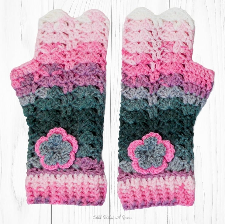 These stunning gloves have been crocheted using a beautiful shell stitch pattern, they have a ribbed cuff and a pretty two layered flower for decoration.