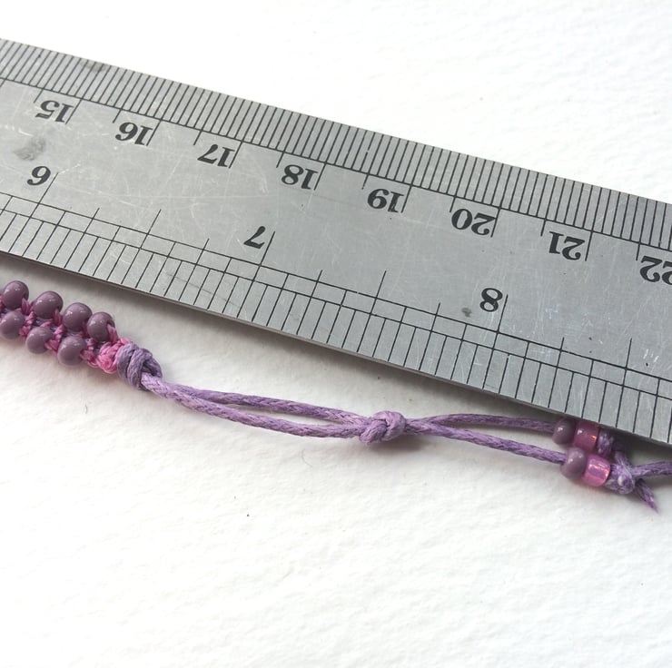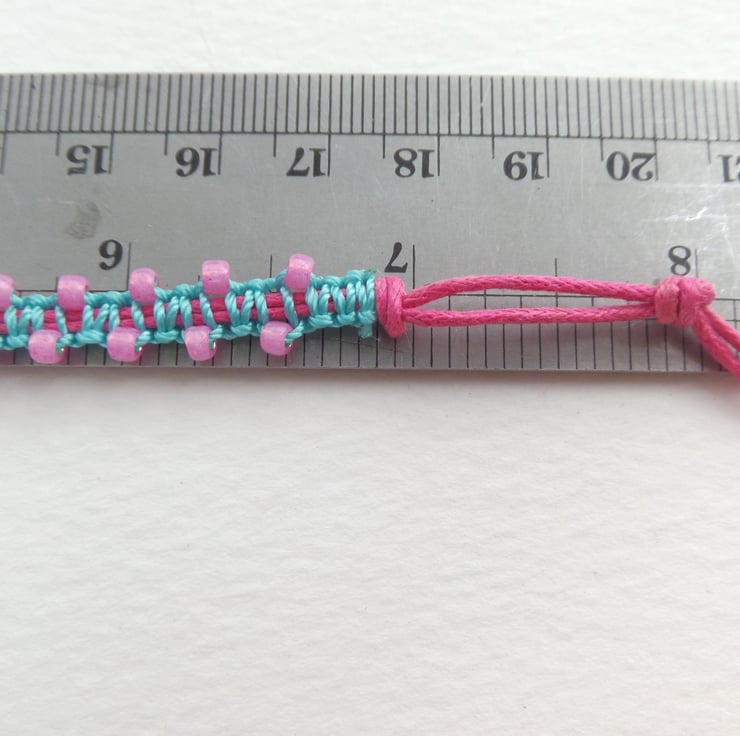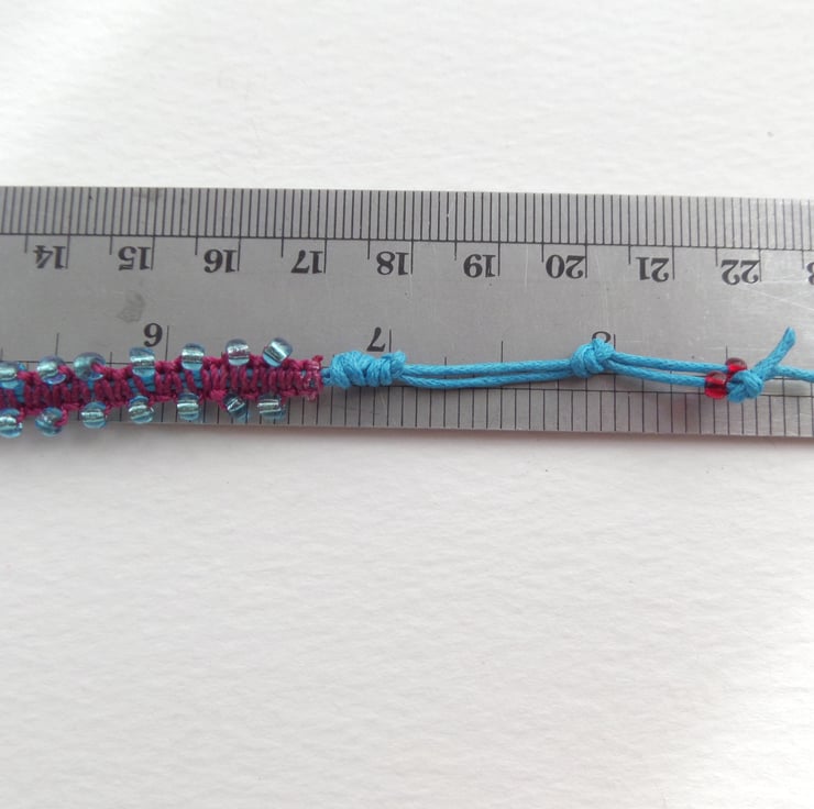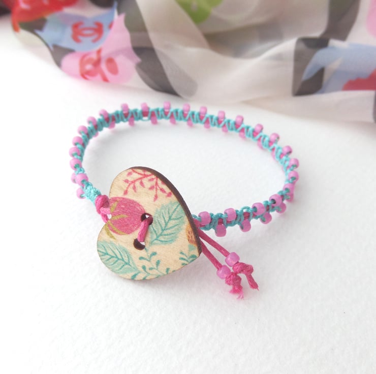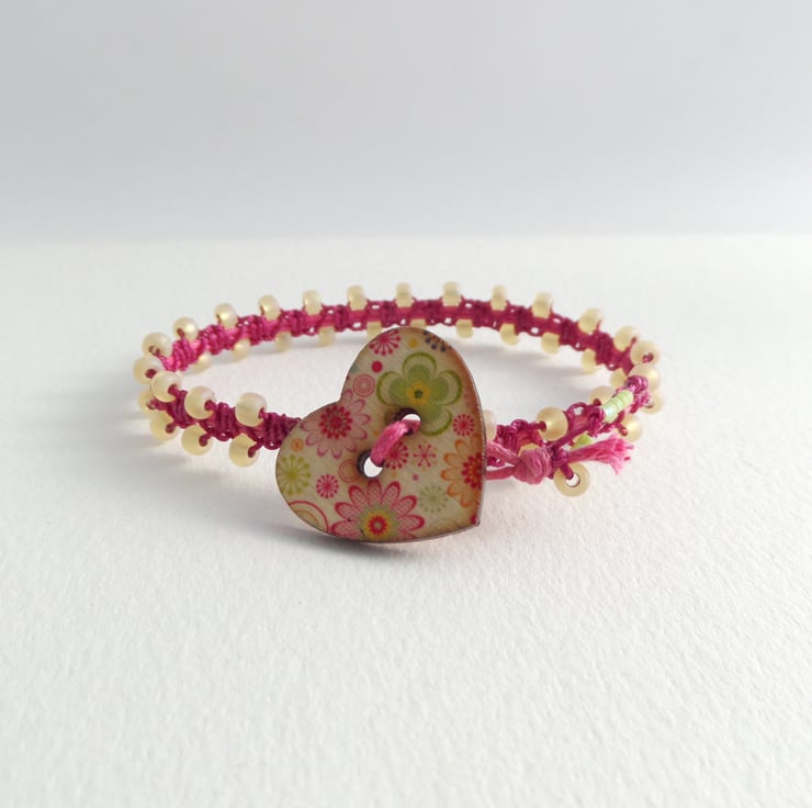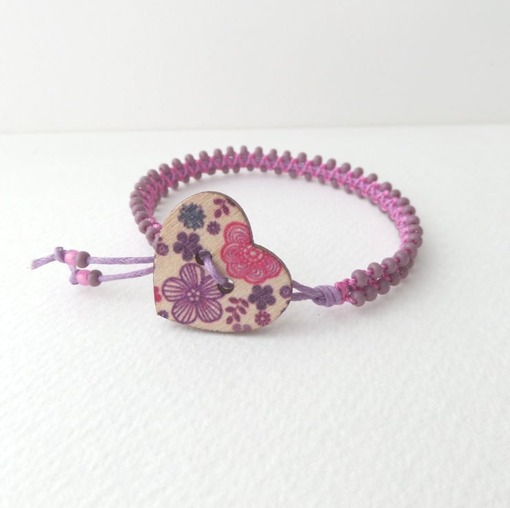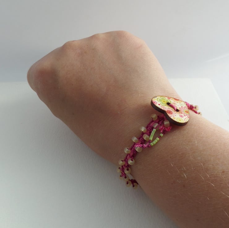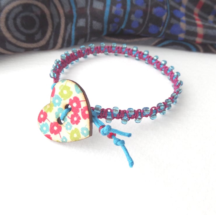 Pretty beaded macramé bracelet on cotton cord with contrasting macrame & feature wooden heart clasp.