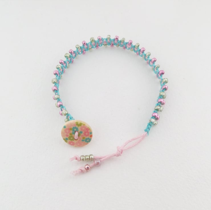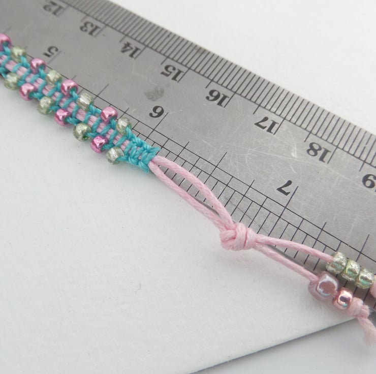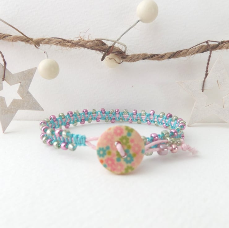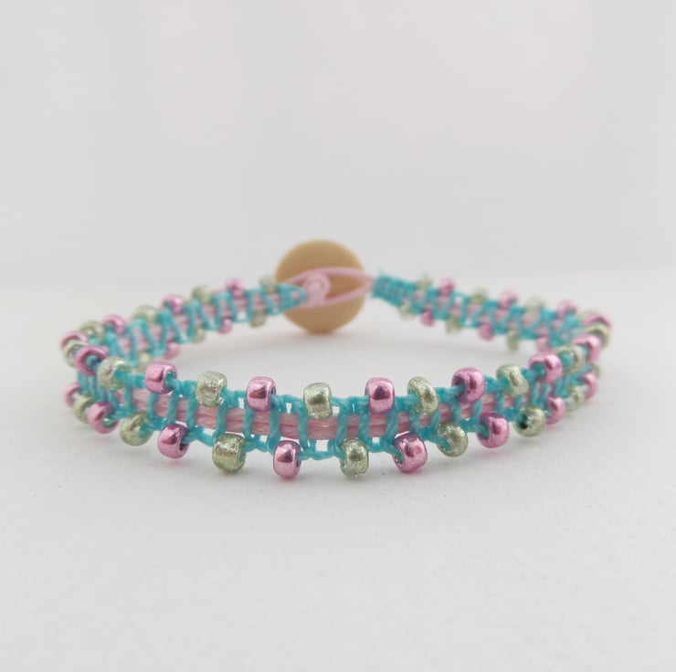 Pretty metallic pink, green beaded, aqua macramé bracelet on pink cotton.