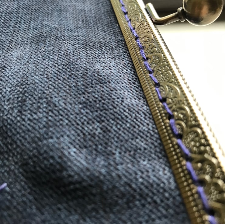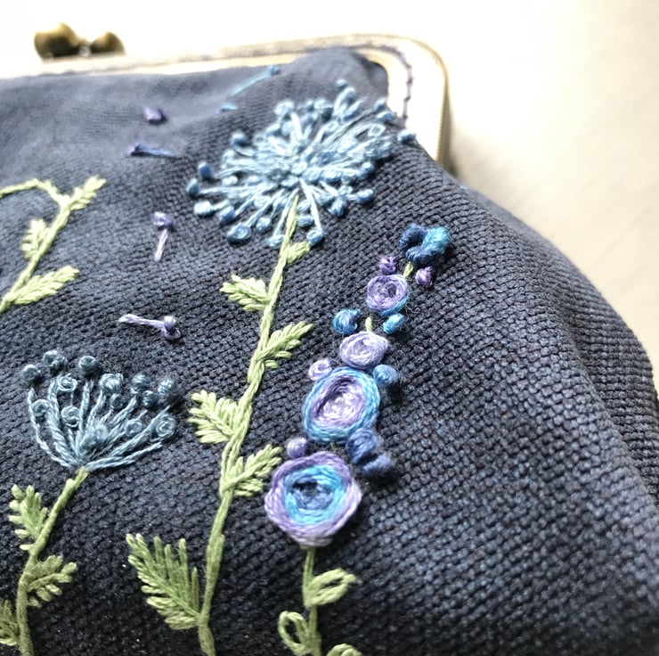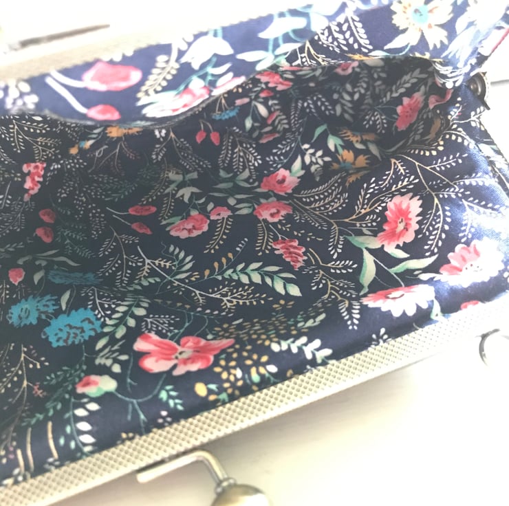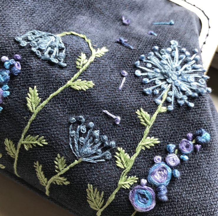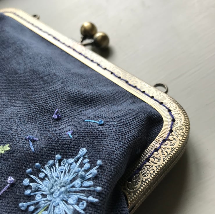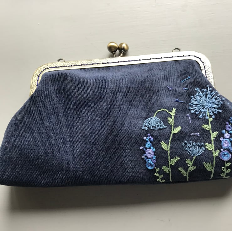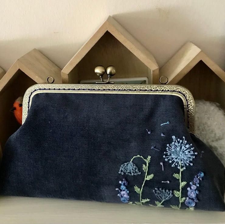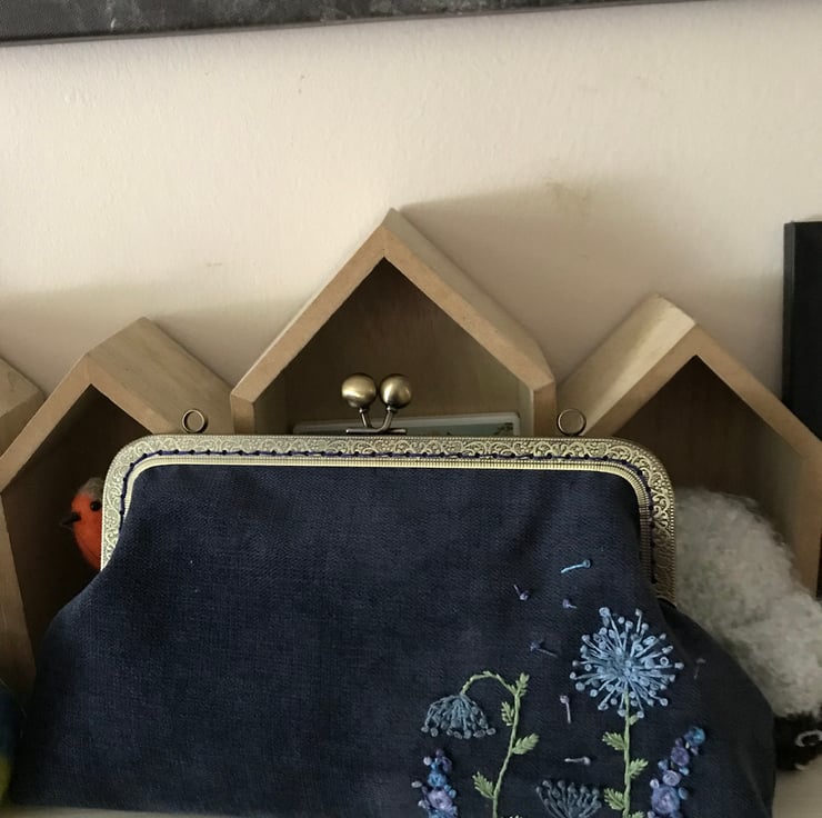 Lovely textured velvet Purse. I have loved embroidering the Blue themed flowers on this purse. The velvet used to make the purse is a firmer rubber backed fabric and give the purse a firmer feel to it. It has a co-ordinating funky cotton fabric lining which makes opening it a delight. The embroidery is done in a mix of blues and lilacs with greens for the leaves and stalks. The purse uses an metal frame in antique brass and is sewn in using navy matching thread. Measurements are 26cm wide by 17cm deep.
