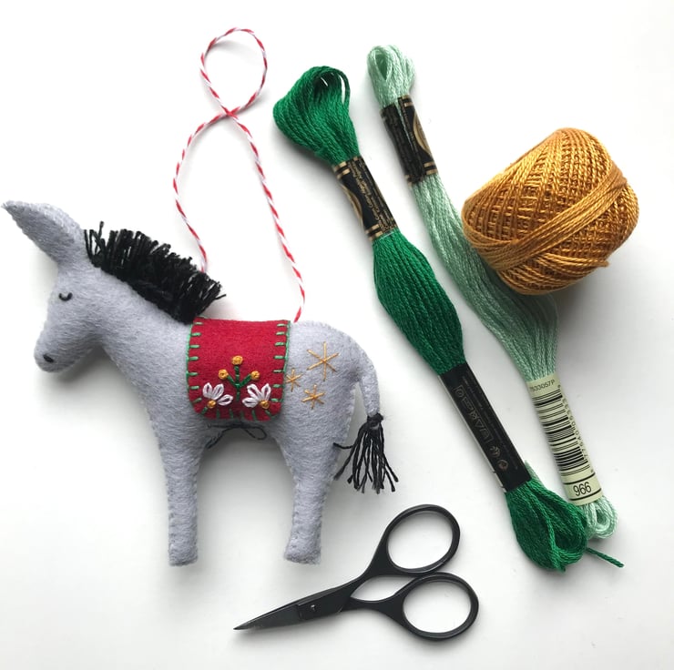 Made in soft 100% wool felt, the donkey is completely stitched by hand and finished with an embroidered blanket. The mane is hand stitched with perlé and wool thread. The donkey has tiny embroidered details, meaning no two are the same. This is a lovely decoration to be treasured for years to come.