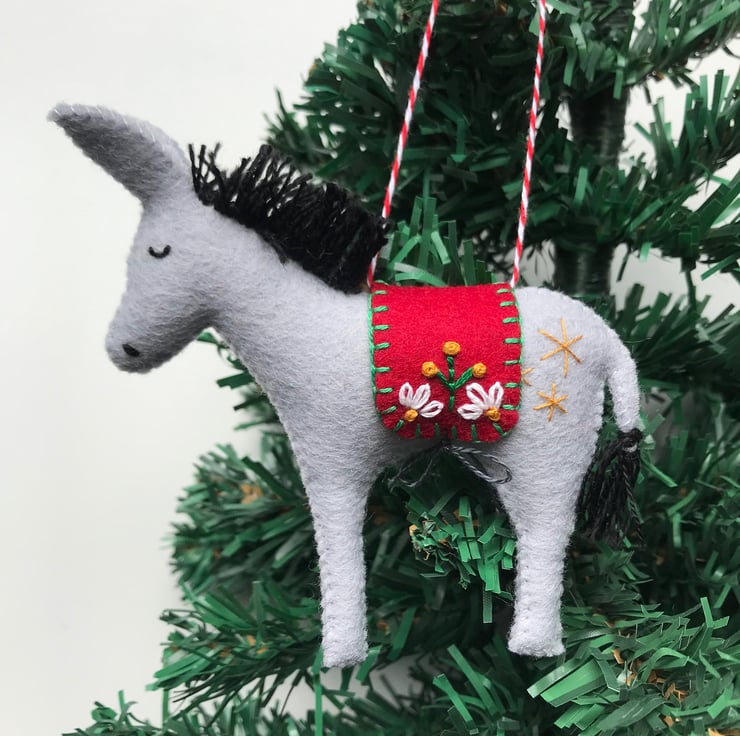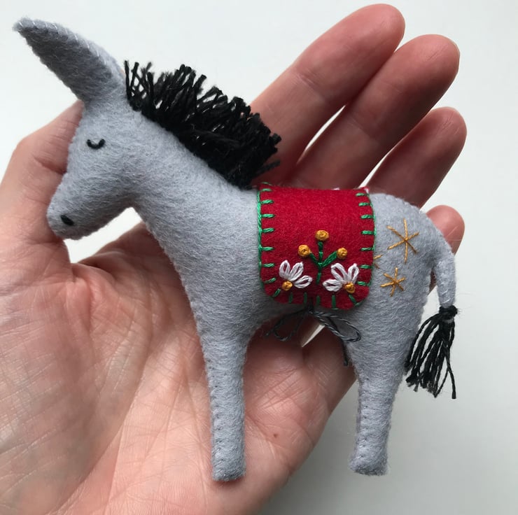 The donkey is 10cm /4” tall from ear tip to hoof. He hangs from a twine loop so can go straight on your Christmas tree. He is made from a pale grey wool felt, and wrapped in a hand embroidered blanket.
