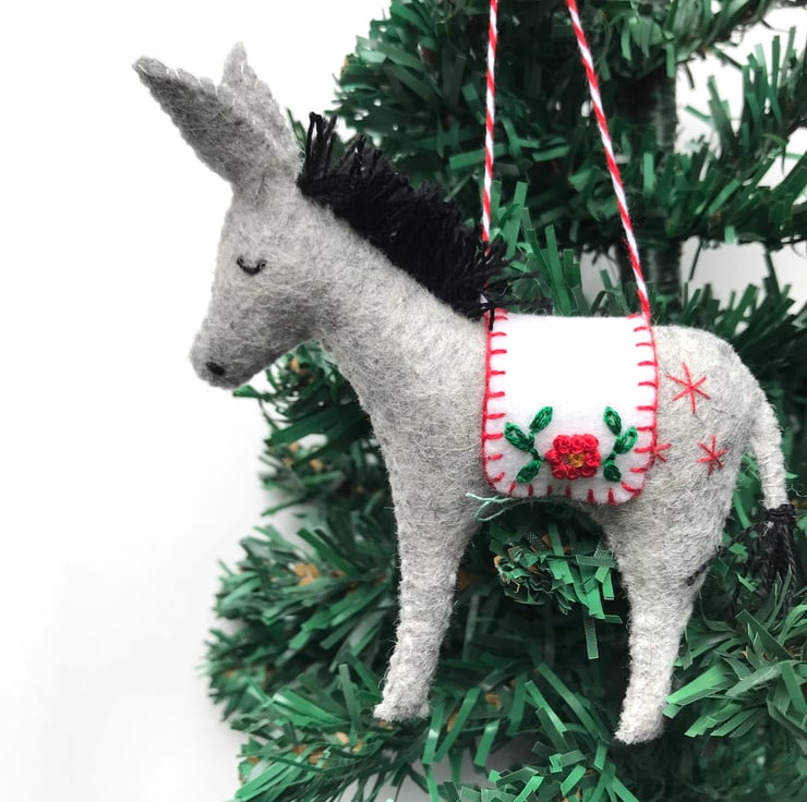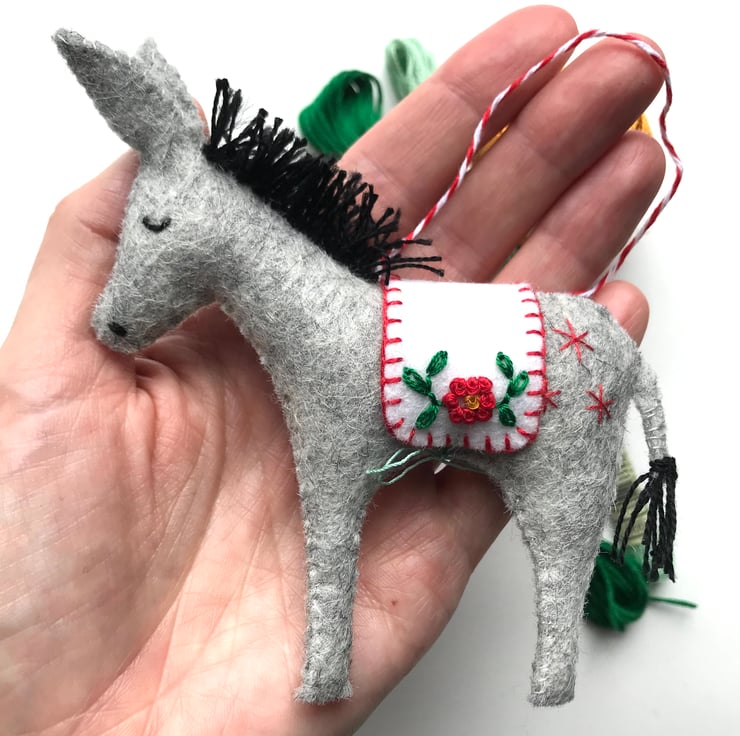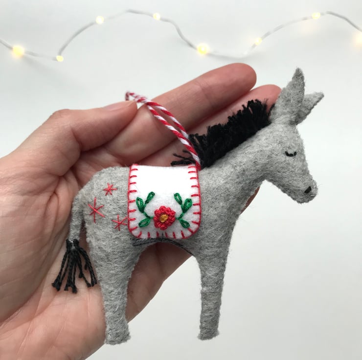 The donkey is 10cm /4” tall from ear tip to hoof. He hangs from a twine loop so can go straight on your Christmas tree. He is made from a pale grey marl wool felt, and is wrapped in a hand embroidered blanket.