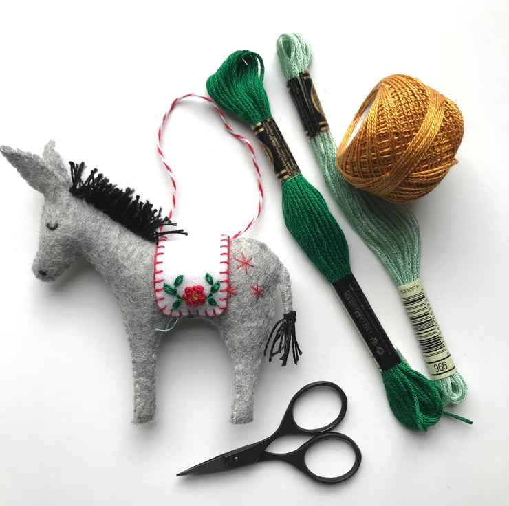 Made in soft 100% wool felt, the donkey is completely stitched by hand and finished with an embroidered blanket. The mane is hand stitched with perlé and wool thread. The donkey has tiny embroidered details, meaning no two are the same. This is a lovely decoration to be treasured for years to come.