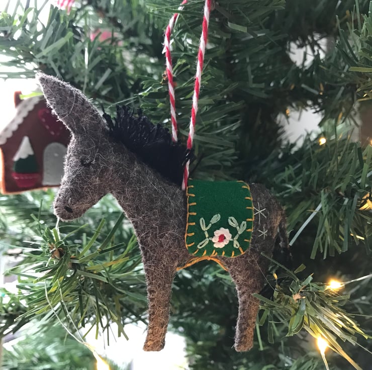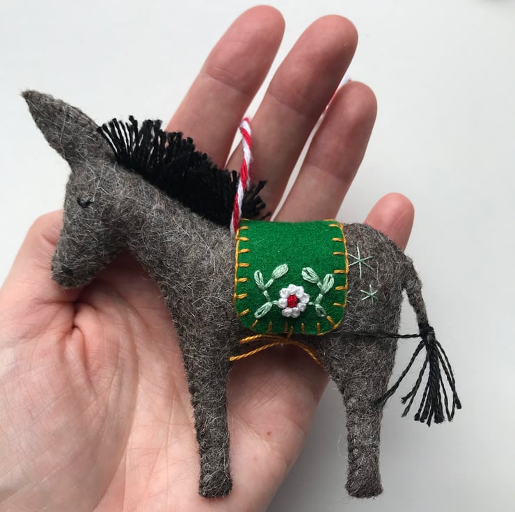 The donkey is 10cm /4” tall from ear tip to hoof. He hangs from a twine loop so can go straight on your Christmas tree. He is made from a brown marl wool felt, and you can choose a style of hand embroidered blanket for him, please see the photo and options available.