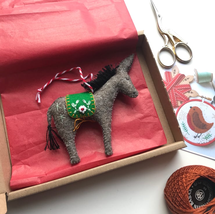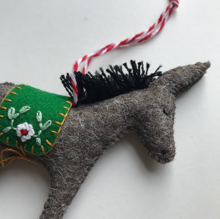 Made in soft 100% wool felt, the donkey is completely stitched by hand and finished with an embroidered blanket. The mane is hand stitched with perlé and wool thread. The donkey has tiny embroidered details, meaning no two are the same. This is a lovely decoration to be treasured for years to come.
