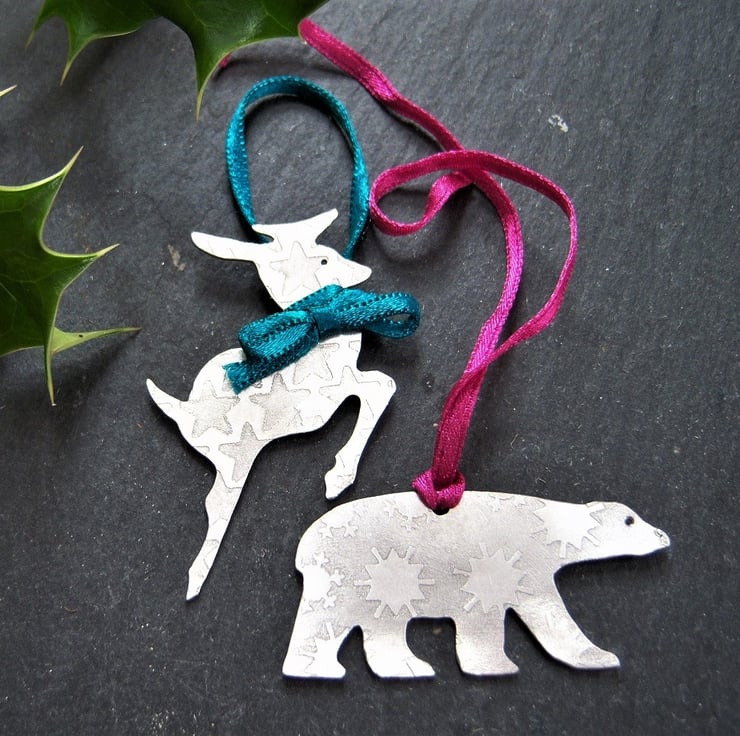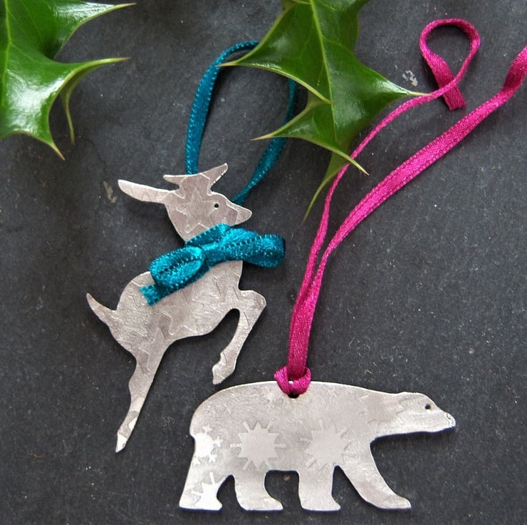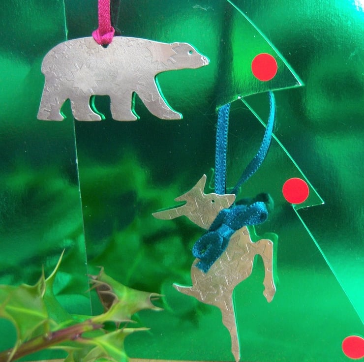 The reindeer has the star pattern, is approximately 6cms tall and the ribbon is a greeny turquoise. The polar bear has the snowflake pattern, is almost 6cms long and the ribbon is magenta/dark pink.