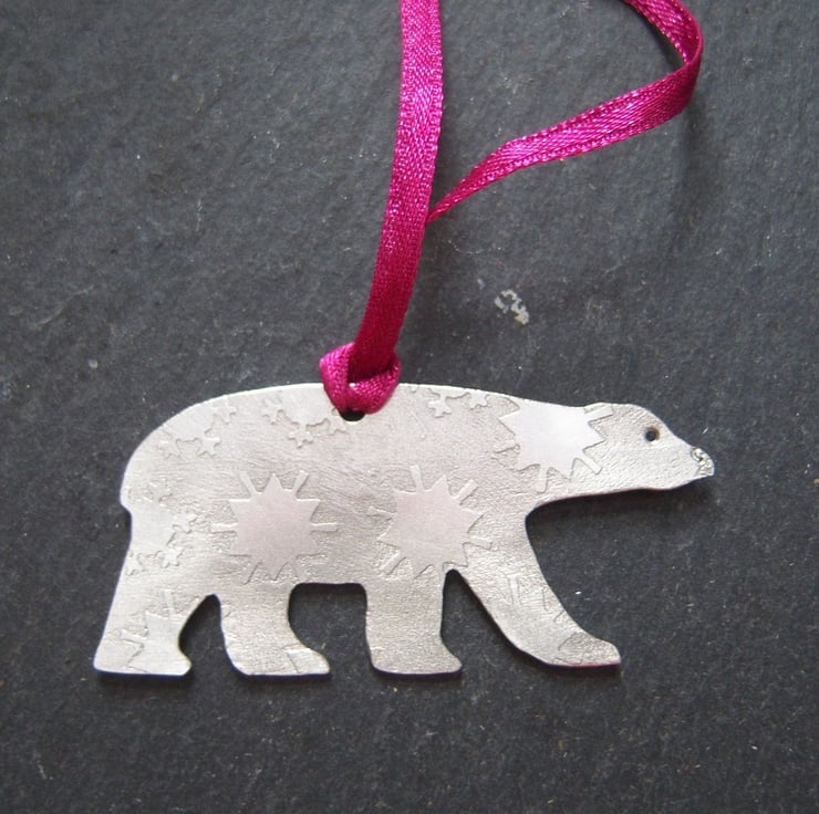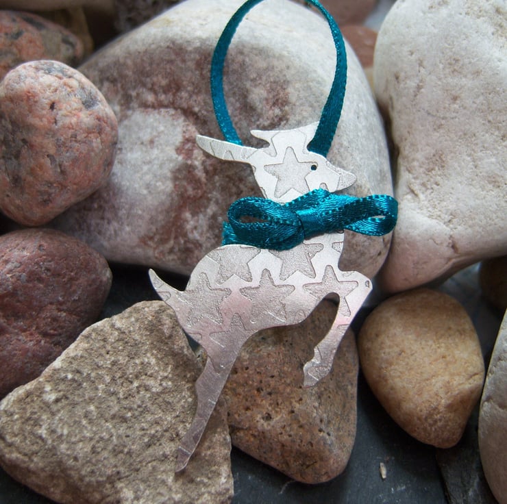 These two decorations have been cut from pewter sheet that I have etched with random star and snowflake patterns.