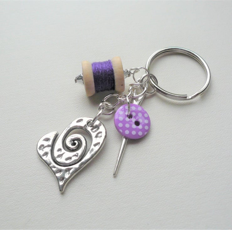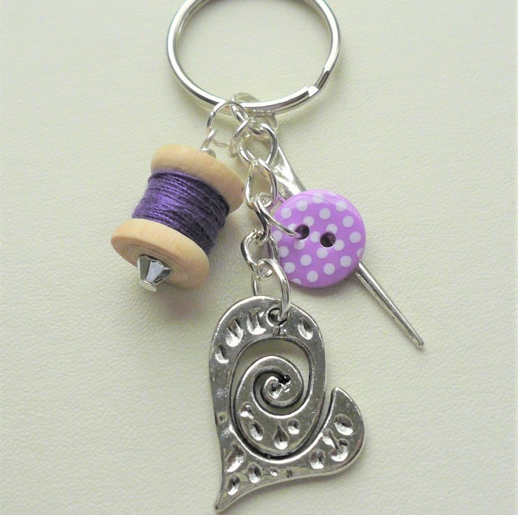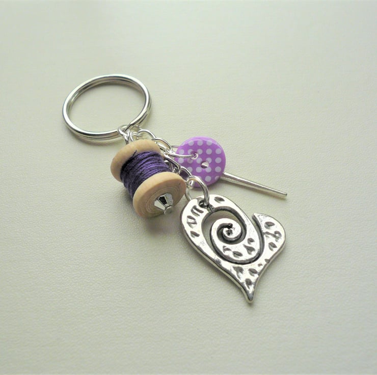 Pretty sewing themed keyring or bag charm made up of 15mm long wooden threaded cotton reel, acrylic spotted button and Tibetan silver needle charm with 25mm heart charm hanging below. All attached to 25mm silver plated keyring and chain and measures approx 8cm incl ring.