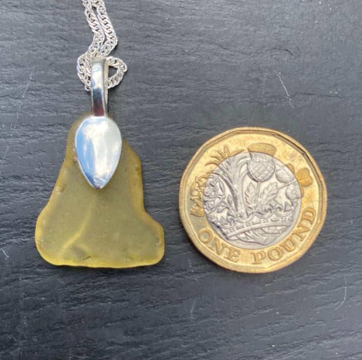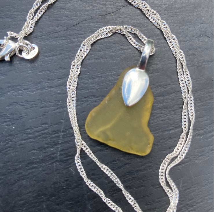 Yellow seaglass is very unusual to find. This lemon yellow piece has made a lovely little pendant. Very much a unique piece of jewellery.