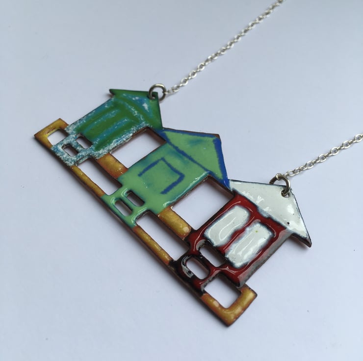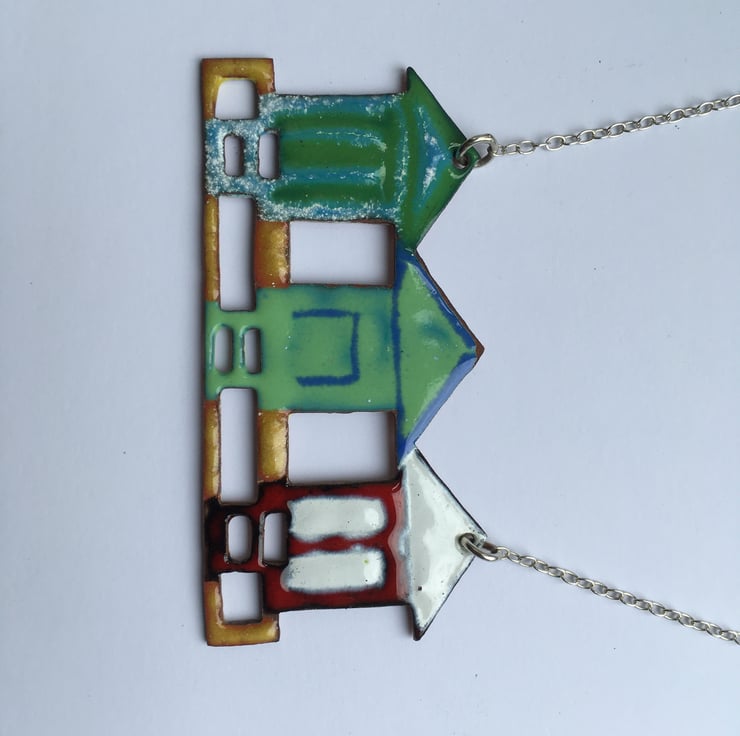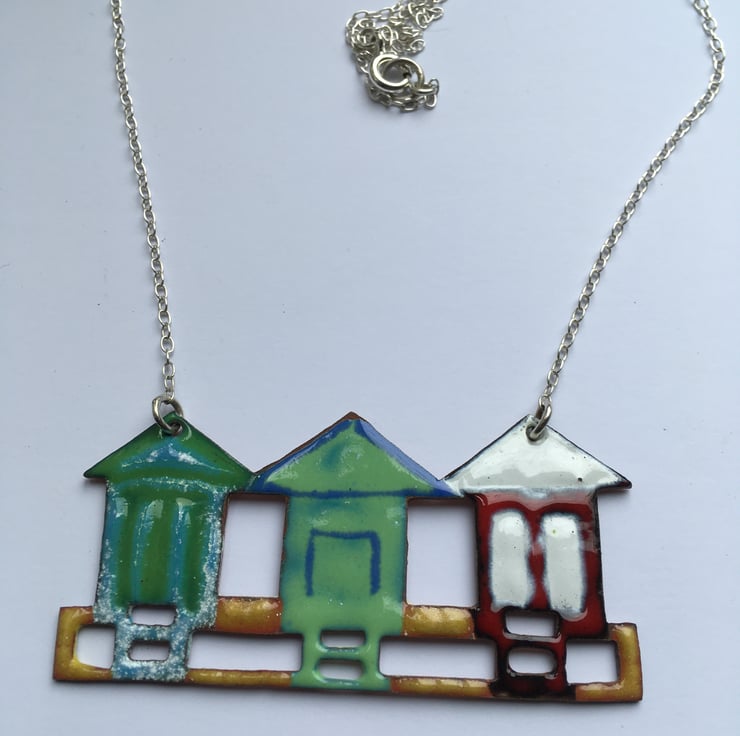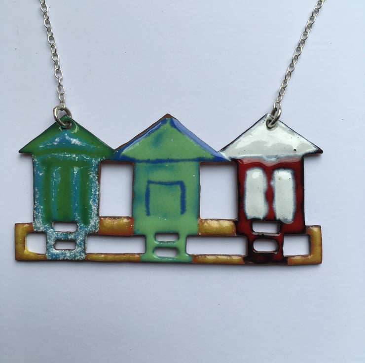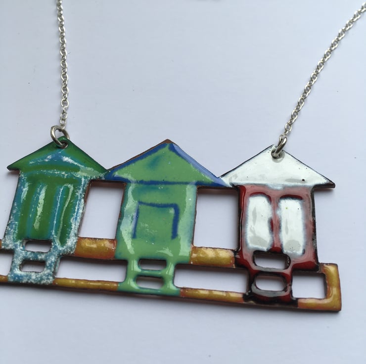 This little row of Beach Huts have been pierced out from copper sheet and glass enamel powder has been painstakingly painted on before going into a kiln . These are not like commercially enamelled pieces and do not have a flat surface but are more organic, this makes each piece unique and obviously handmade.