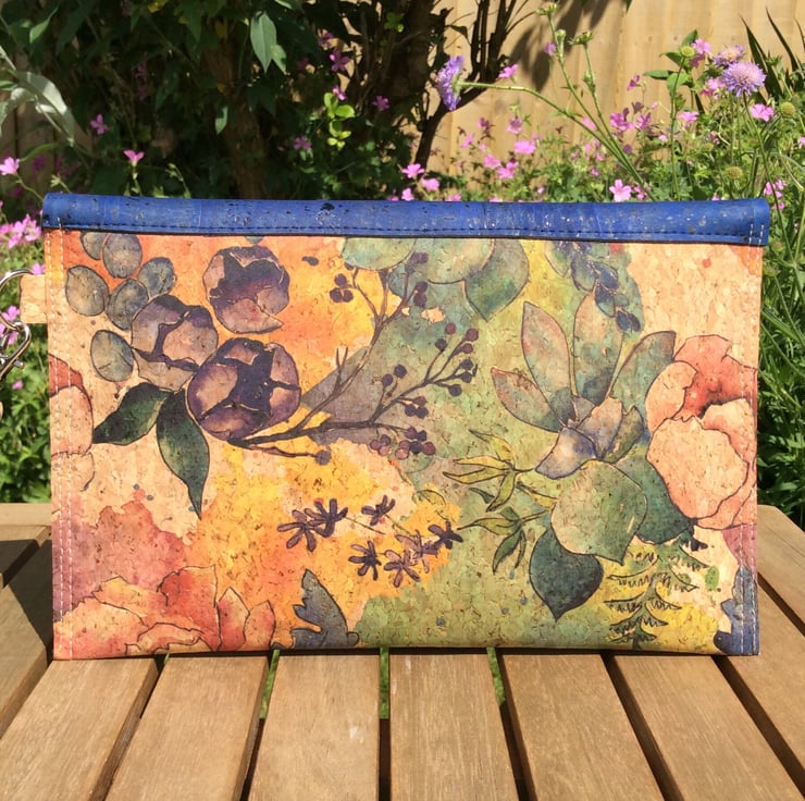 Slim and lightweight this elegant little handbag is perfect for summer parties, weddings and evenings. It is made from natural cork fabric in a watercolour flowers print and has a contrasting navy blue flap. It comes with a detachable wrist strap, has a magnetic clasp and is lined with a pretty soft peach cotton fabric.