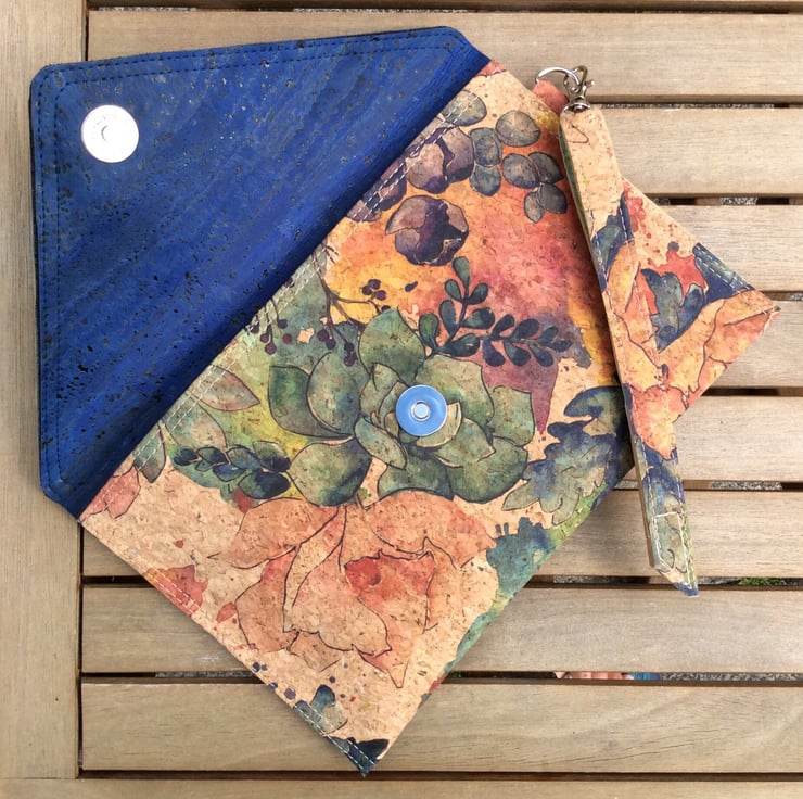 Envelope style clutch bag handmade in cork fabric.