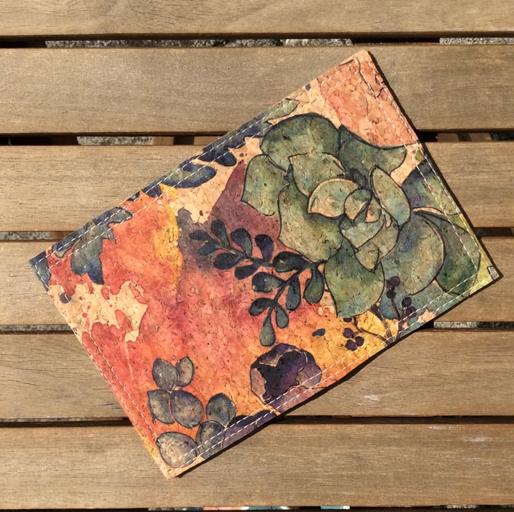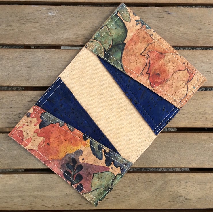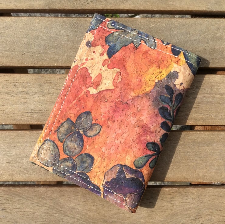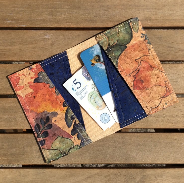 A card holder, or small wallet, hand made from natural cork fabric. The simple folding design is handy for cards or notes and perfect for the summer when you don’t want to carry a lot. The outside is a summery watercolour flowers design. Inside the asymmetrical pockets are in the same fabric with a contrasting dark denim blue.