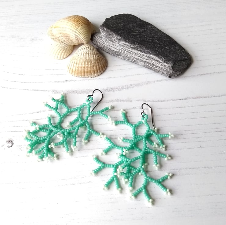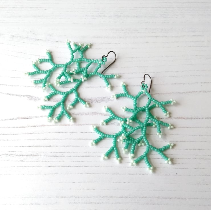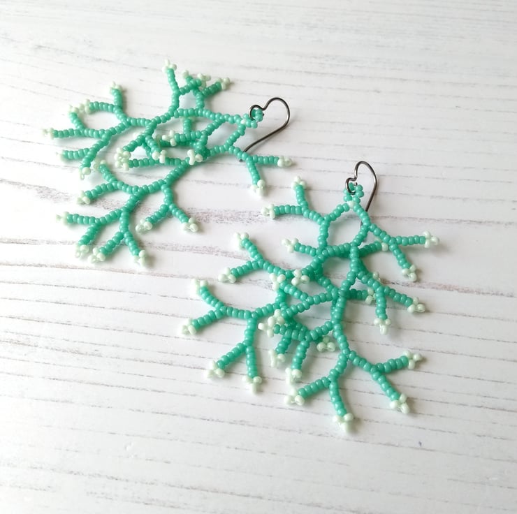 Lightweight and eye-catching, I have used glass seed beads in a pastel mint green, plus accent beads in a light green. Each earring consists of two “fronds”, so the earrings have a nice bit of movement to them.