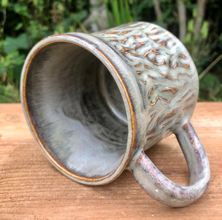 Unique wheel thrown pottery mug that has been hand carved. To give it this beautiful tactile texture.