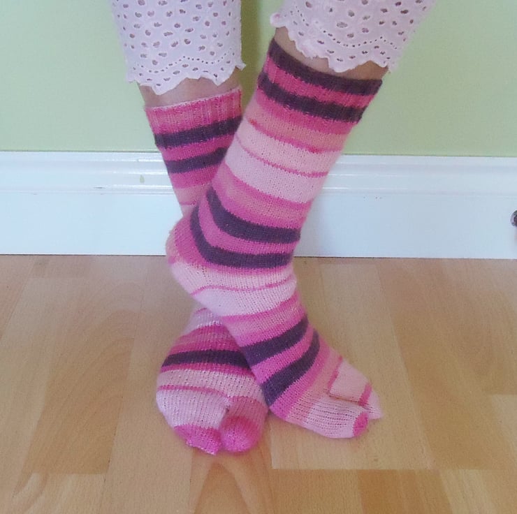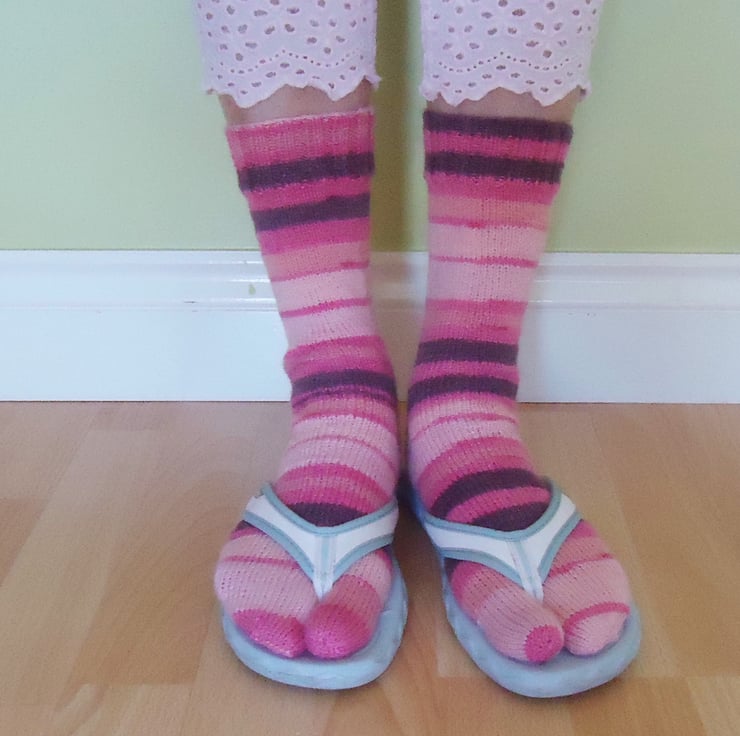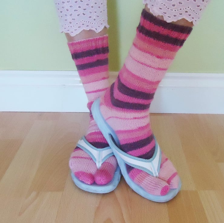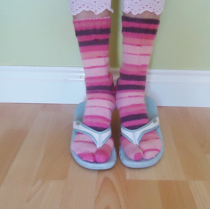 These flip flops socks are hand knitted with wool and nylon.