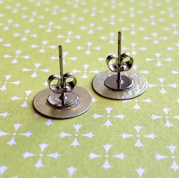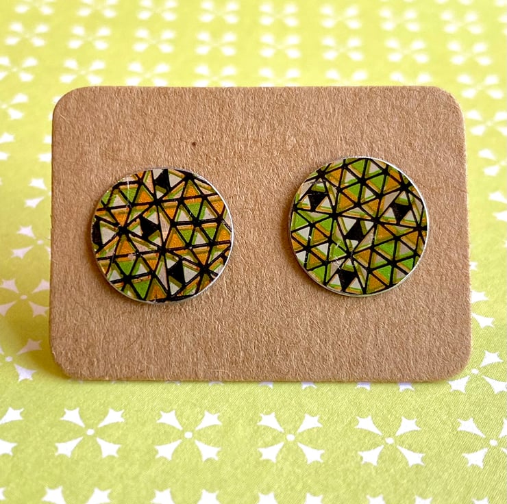 These studs feature an almost 3D effect geometric design made up of triangles. The discs have been hand cut from a vintage trinket tin and smoothed around the edges. With these studs you can wear a little piece of the past!