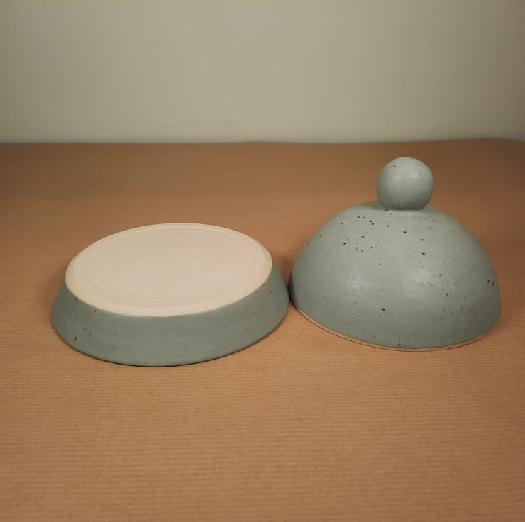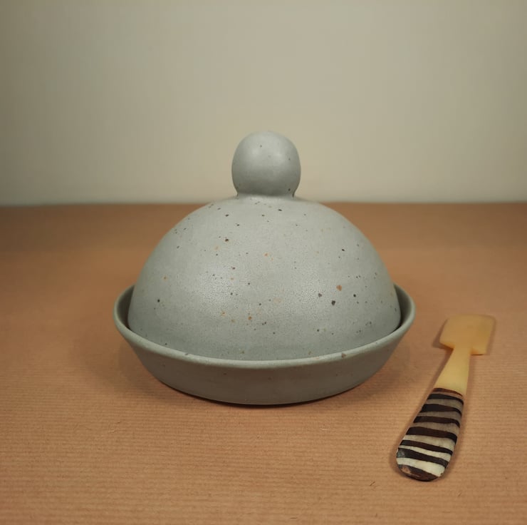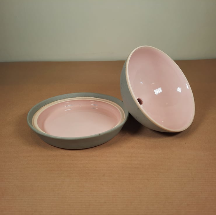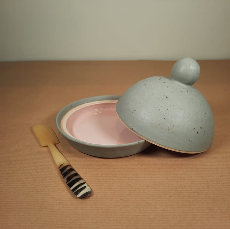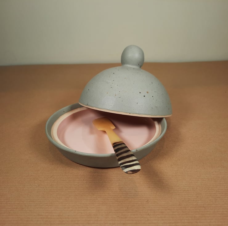 The butter dish has been hand thrown in two parts in high fired stoneware with a pale pink glossy glaze inside and matt grey speckle on the outside.