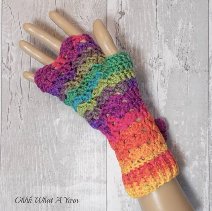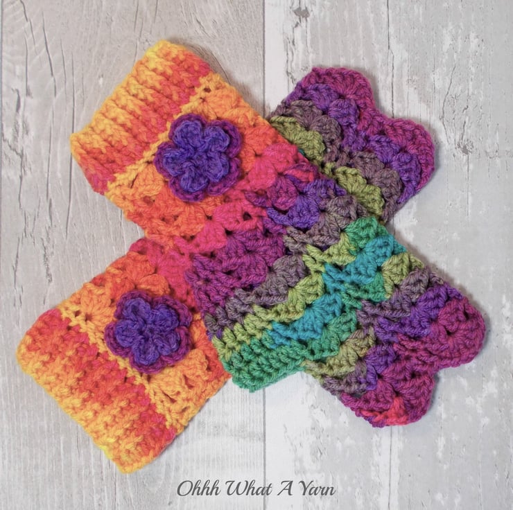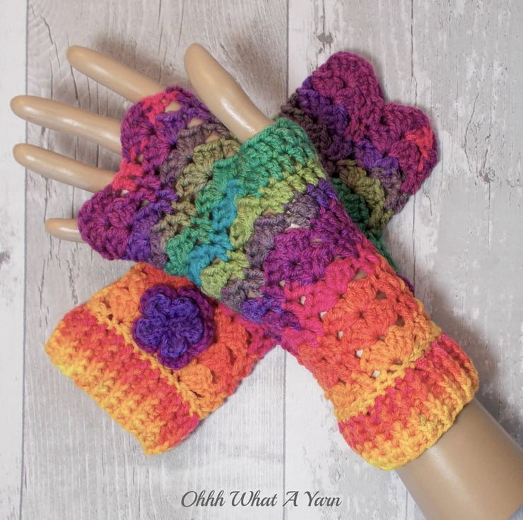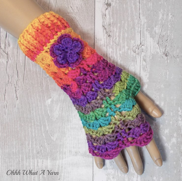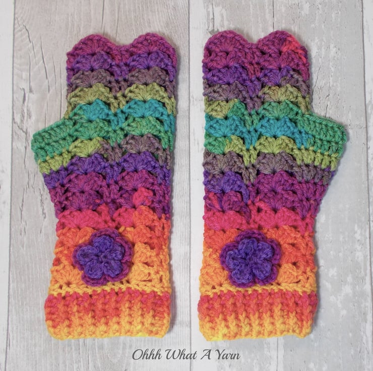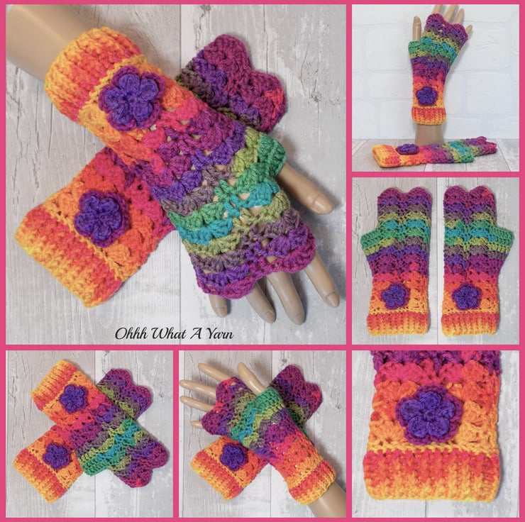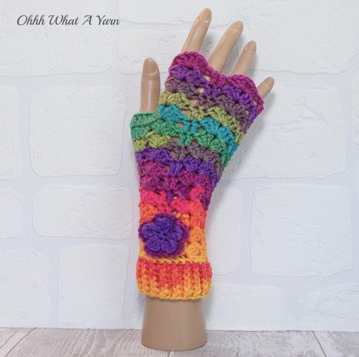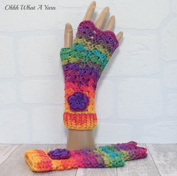 These stunning gloves have been crocheted using a beautiful shell stitch pattern, they have a ribbed cuff and a pretty two layered flower for decoration.