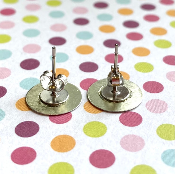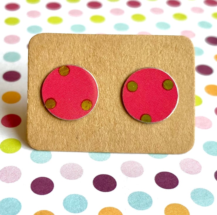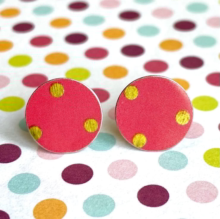 Originating from a small decorative trinket tin, these 11mm disc studs are in a lovely shade of raspberry pink with gold polka dots. They have been cut out by hand and smoothed around the edges. A lovely summery accessory!