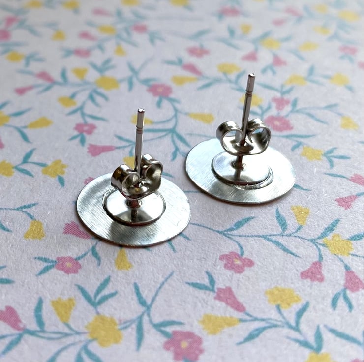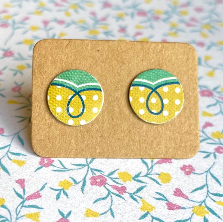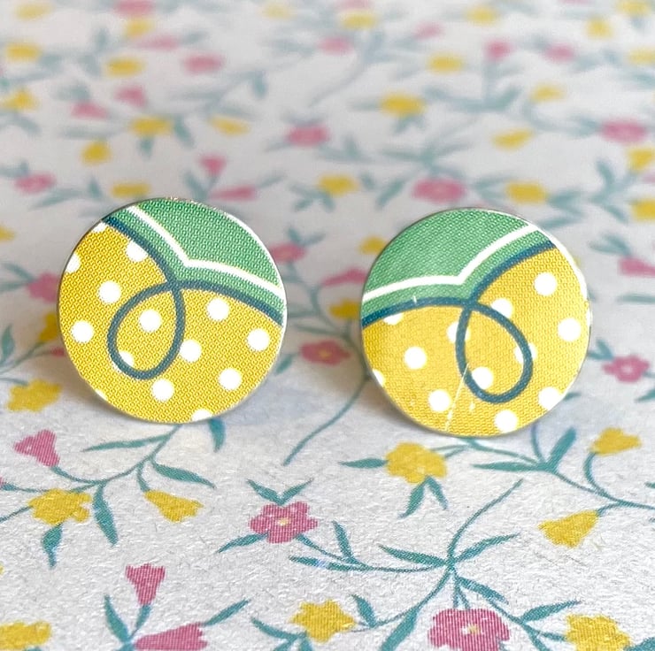 These 12mm disc studs have been hand cut from a lovely little wrist watch tin (which I unfortunately didn't take a photo of before I cut it up!). They are in a lovely shade of sage green and ochre yellow and feature white polka dots and a decorative loop. A lovely vintage style pair of studs!
