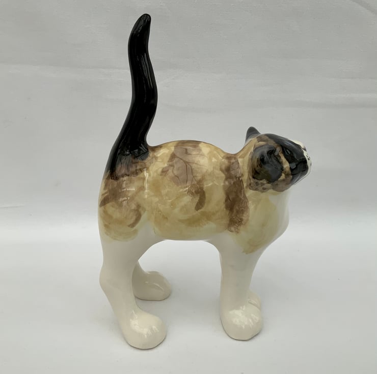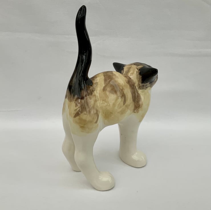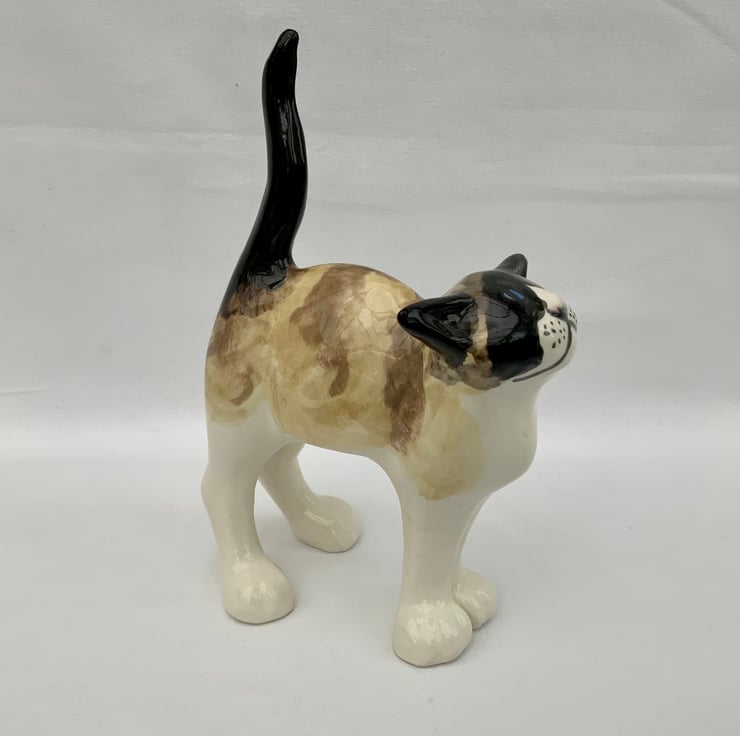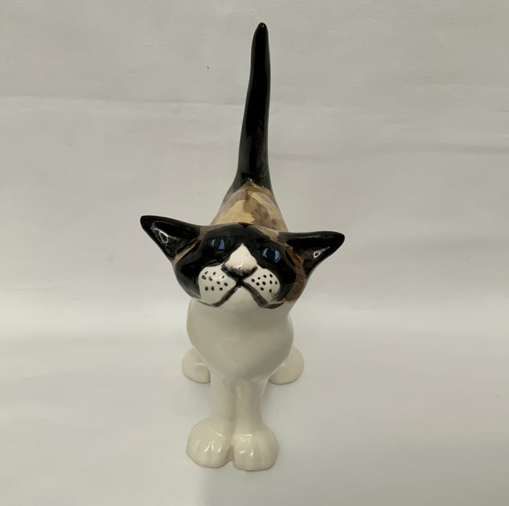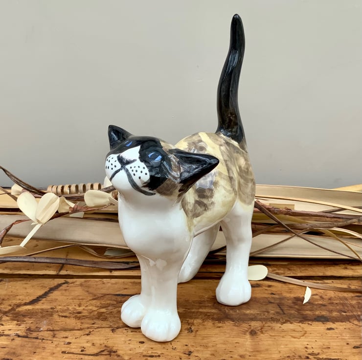 After hand painting the standing cat is finished in a clear gloss glaze and fired to a temperature just above 1100°c