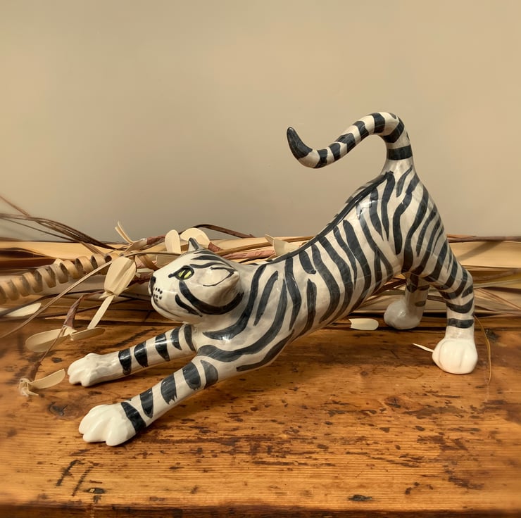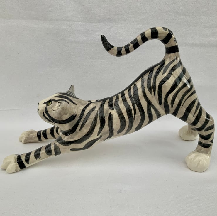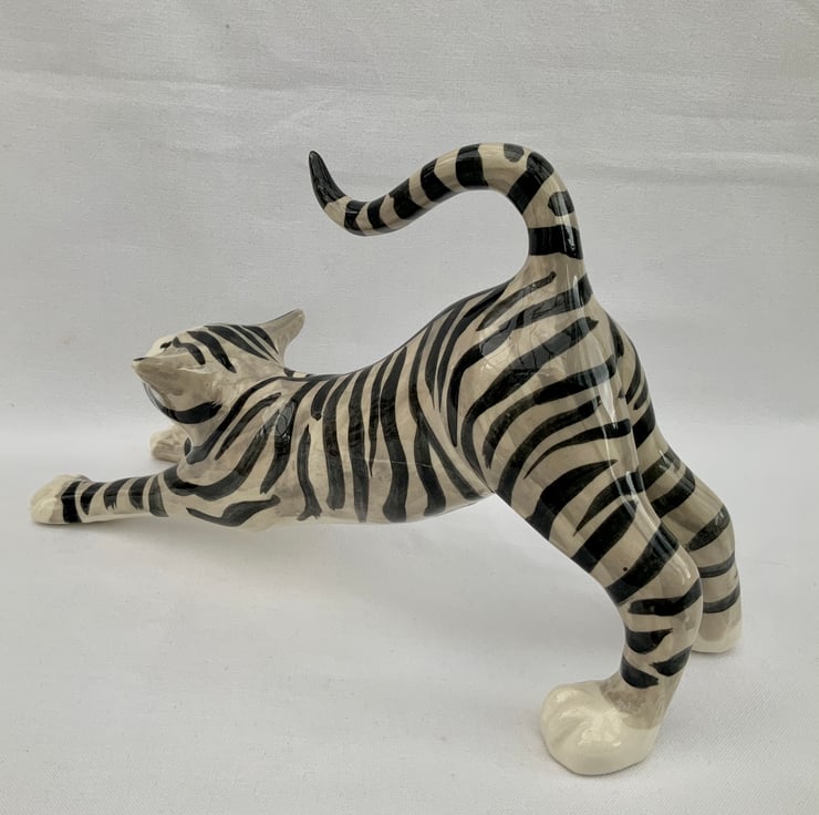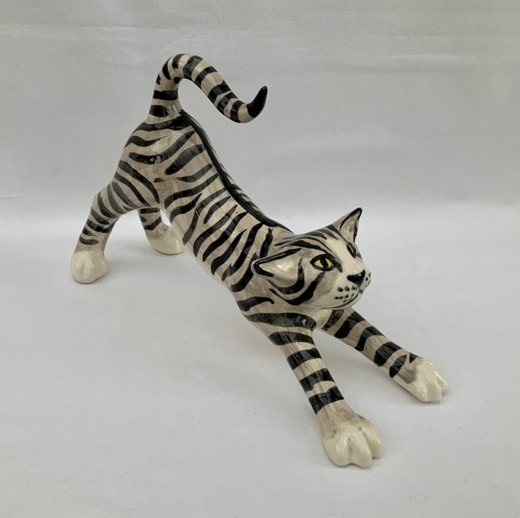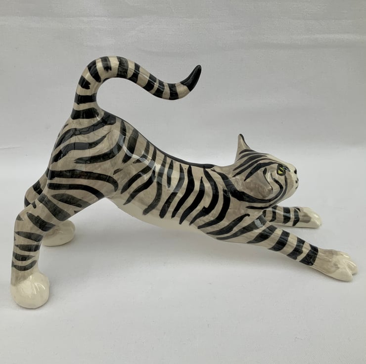 The stretching cat has been finished with a clear gloss glaze and fired to a temperature just above 1100°c