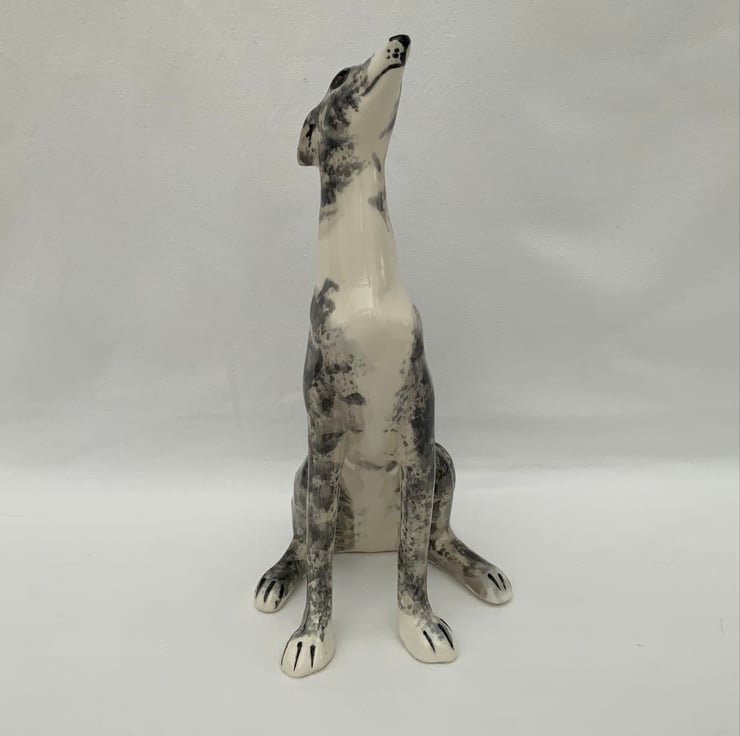After a bisque firing I hand paint the greyhound with underglaze colours black, white and tones of grey, applying them in layers using brushes and sponges.