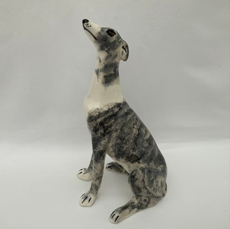 This grey & white brindle sitting greyhound is an original hand painted design and I think makes a delightful ornamental animal figure.