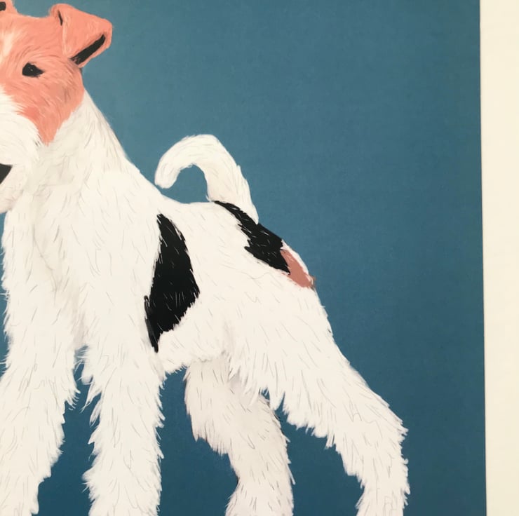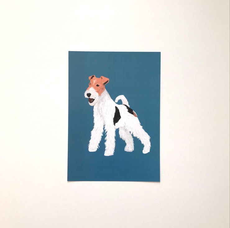 A4 print of a digital drawing of a Wired Hair Fox Terrier stood on a blue background. Retro inspired design, drawn by me.