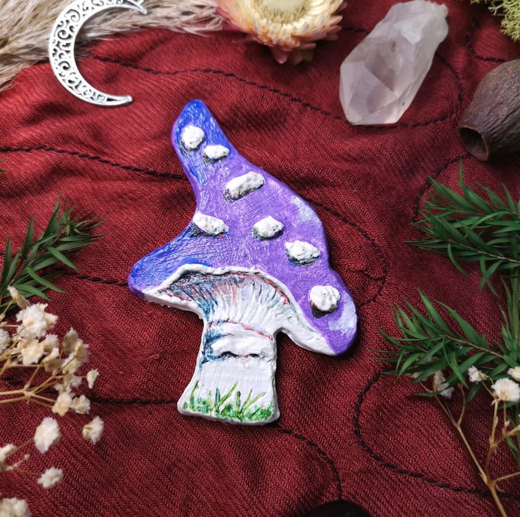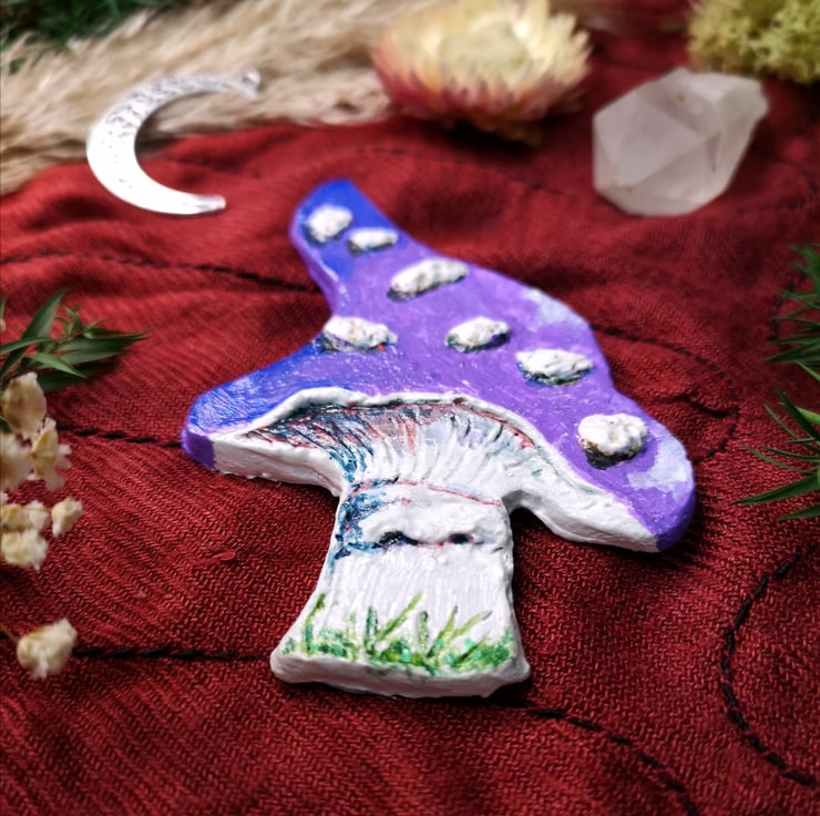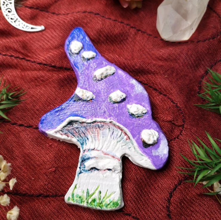 I cut out these mushroom shapes free hand, then once dry I prepare the clay for painting with artist quality acrylic gouache, and once the paint is thoroughly dry, the mushroom is varnished with protective gloss acrylic varnish.