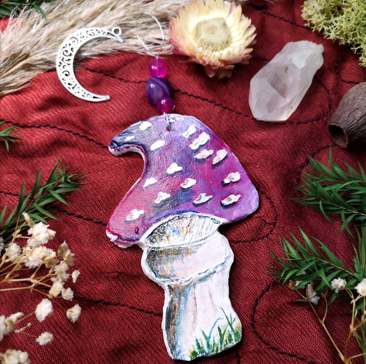 A beautiful magenta mushroom, hand painted and finished with a wire hoop, and purple and magenta beads.