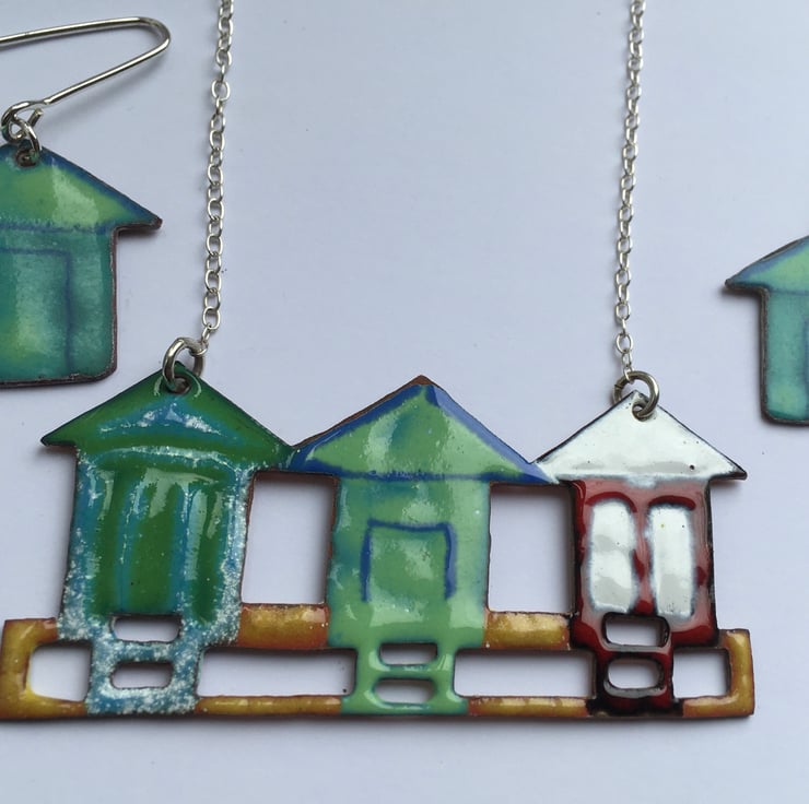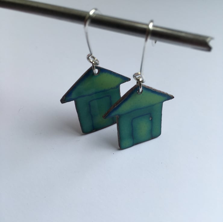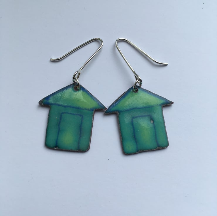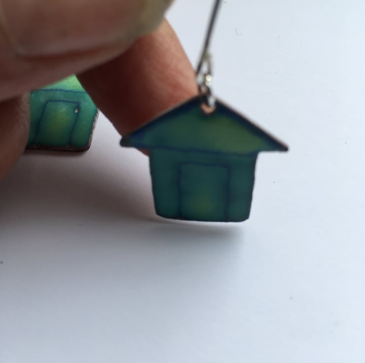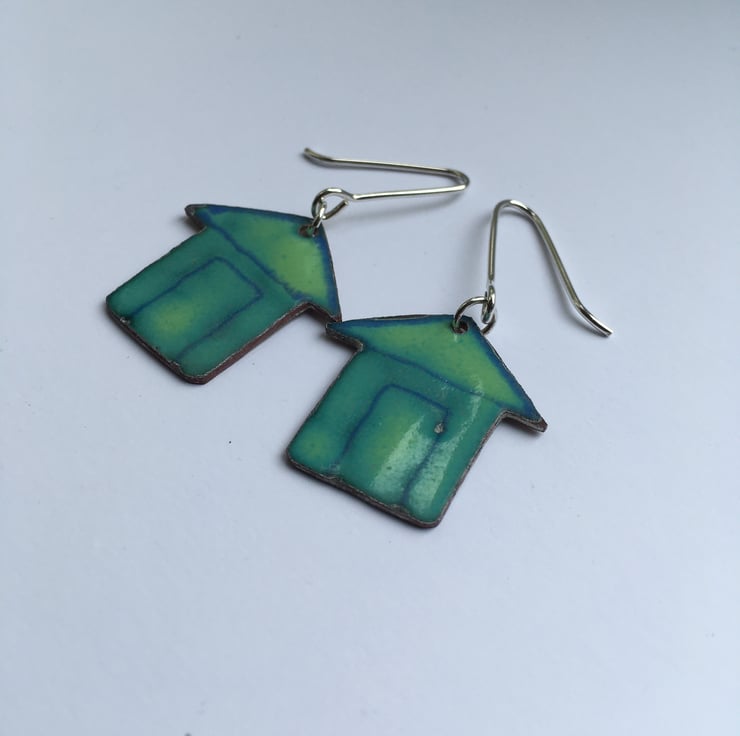 These little Beach Hut Earrings have been made to compliment the necklace. They were pierced out from copper sheet and then glass enamel powder has painstakingly painted on before going into a kiln. These are not like commercially enamelled pieces and do not have a flat surface but are more organic and obviously handmade.