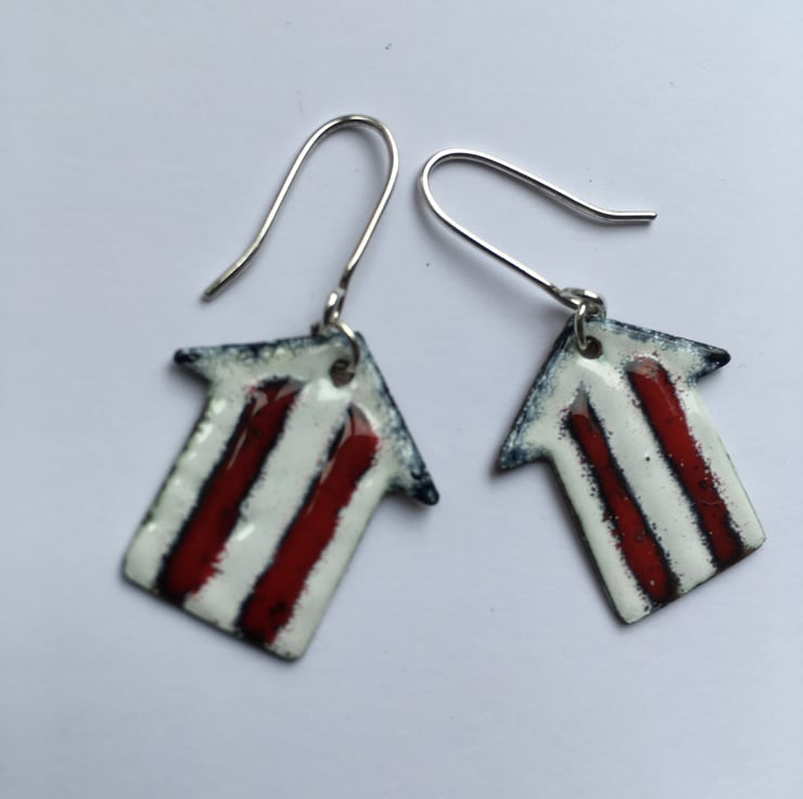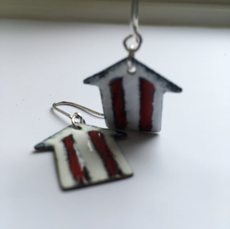 These little Beach Huts have been pierced out from copper sheet and then glass enamel powder has been painstakingly painted on before going into a kiln.
