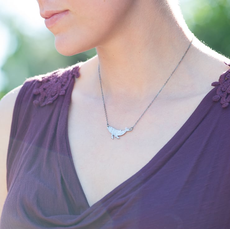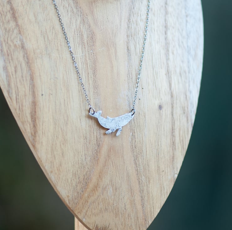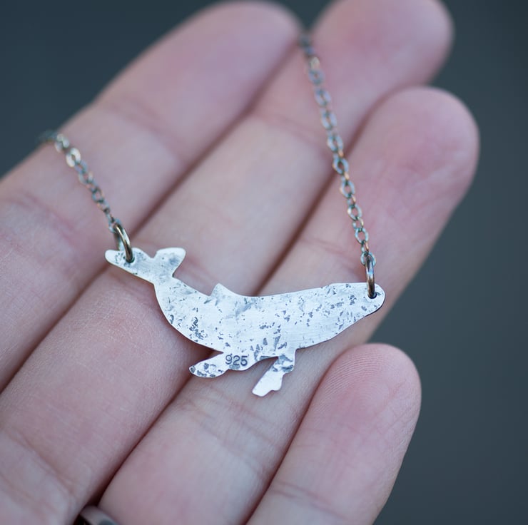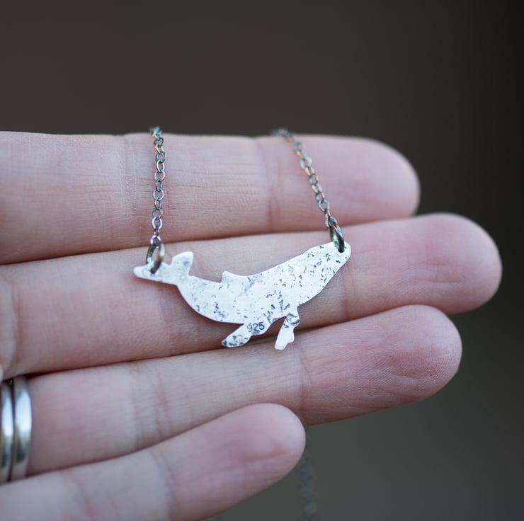 This necklace is handmade to order from sterling silver. I use a jewellers saw to hand cut the whale from a sheet of sterling silver. I then texture the surface of the silver, and oxidized to darken. This is then brushed and polished to highlight the textures.