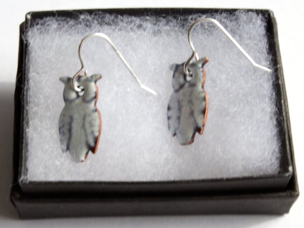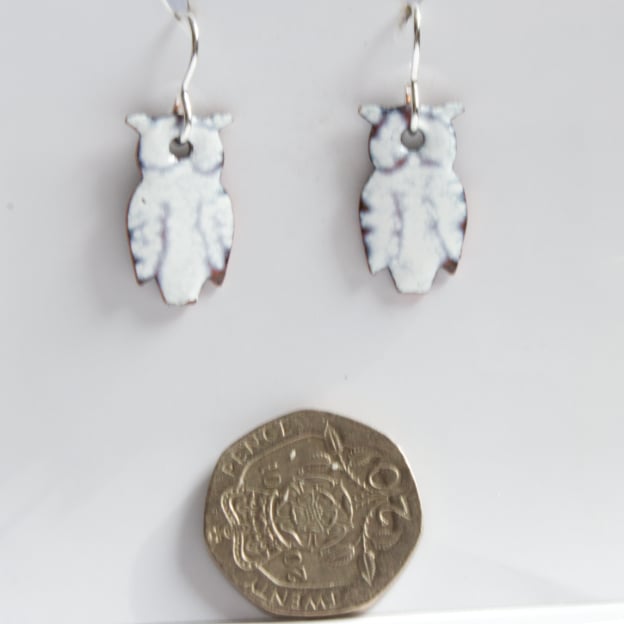 The owls measure 20 by 10mm. I have mounted them on silver fishhook wires.