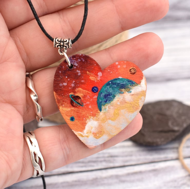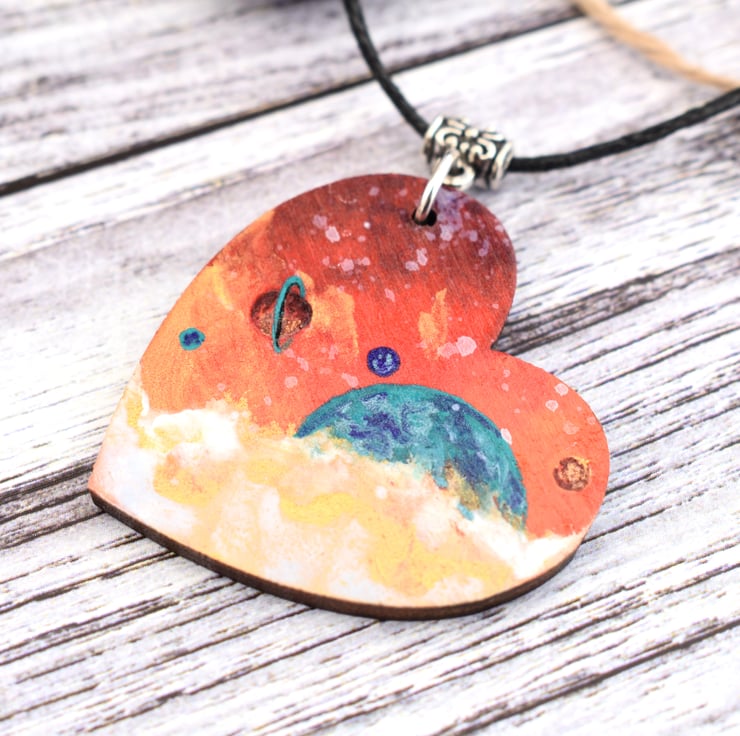 One small step. Wooden heart pendant with a space design of planets and moons.