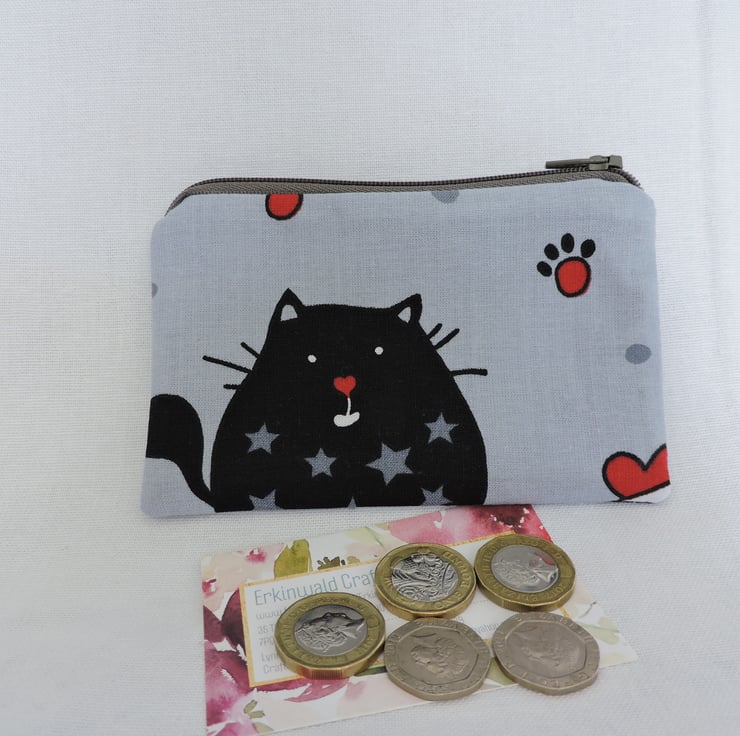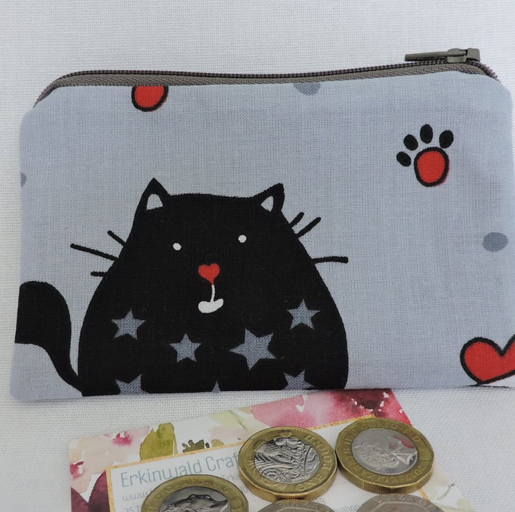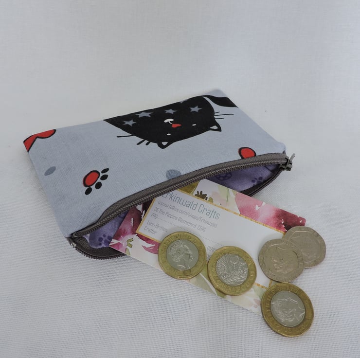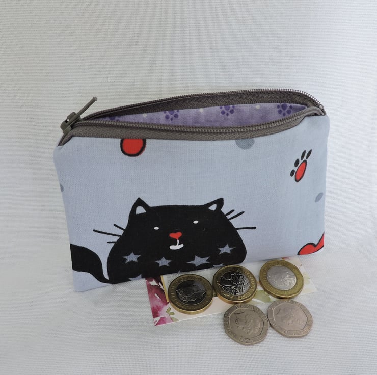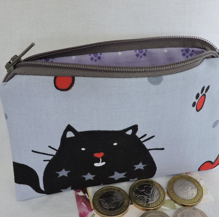 I've made this little coin purse from a cotton fabric which has caricature cats in black, grey, red and white. It is fully lined in a lilac cotton fabric with a lavender geometric design. There is a top zip in dark grey and interfacing to give stability.