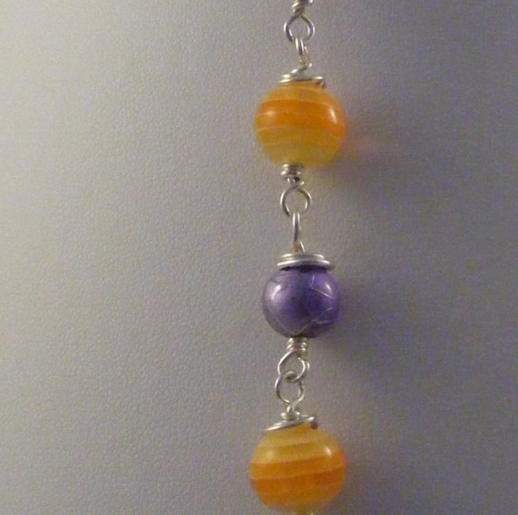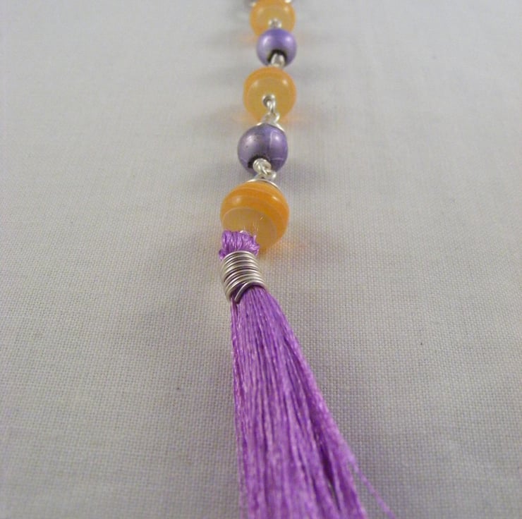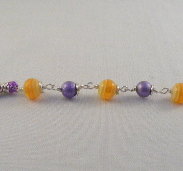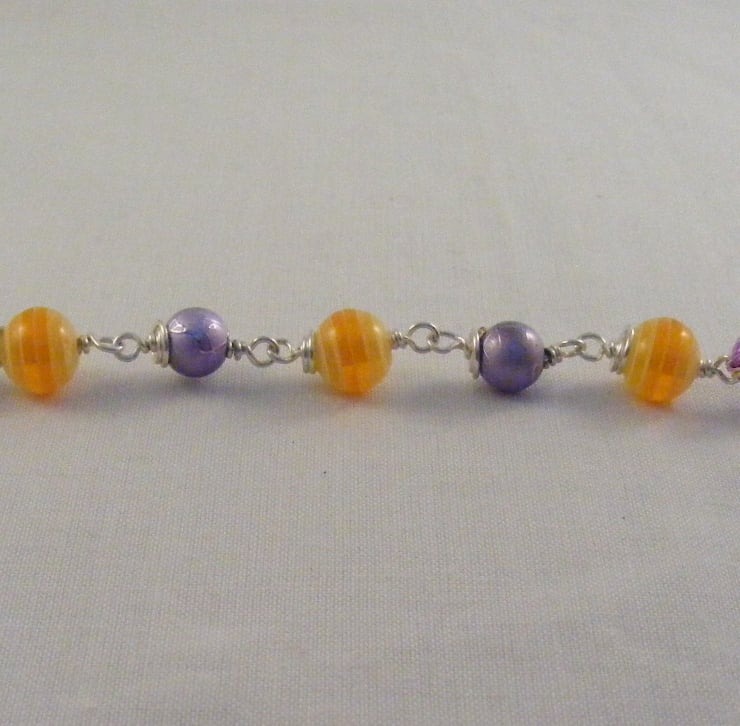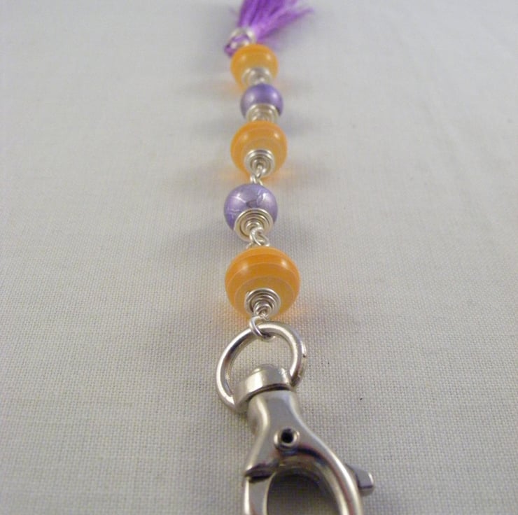 10 mm orange acrylic round beads, 8 mm lilac glass round beads, silver plated wire and swivel clip. Bag charm reduced to clear.