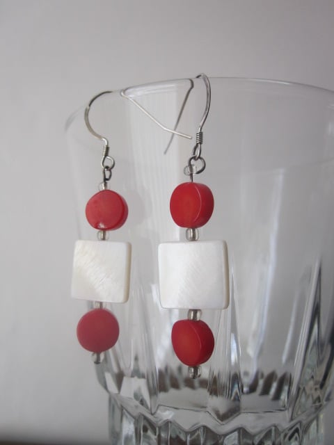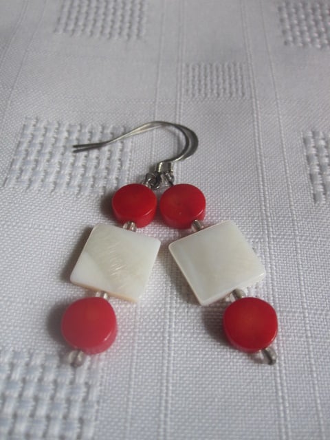 A pair of earrings made using cream coloured shell flat squares and flat round bamboo coral beads. Between these beads are little silver lined clear glass seed beads. They have a drop of approx. 3.8cm and have sterling silver ear wires.