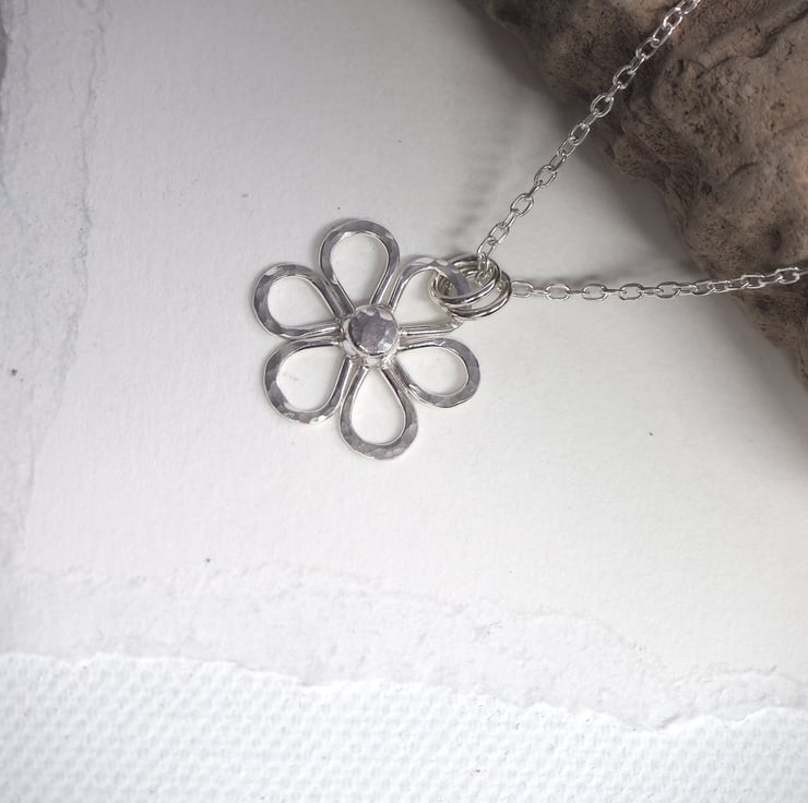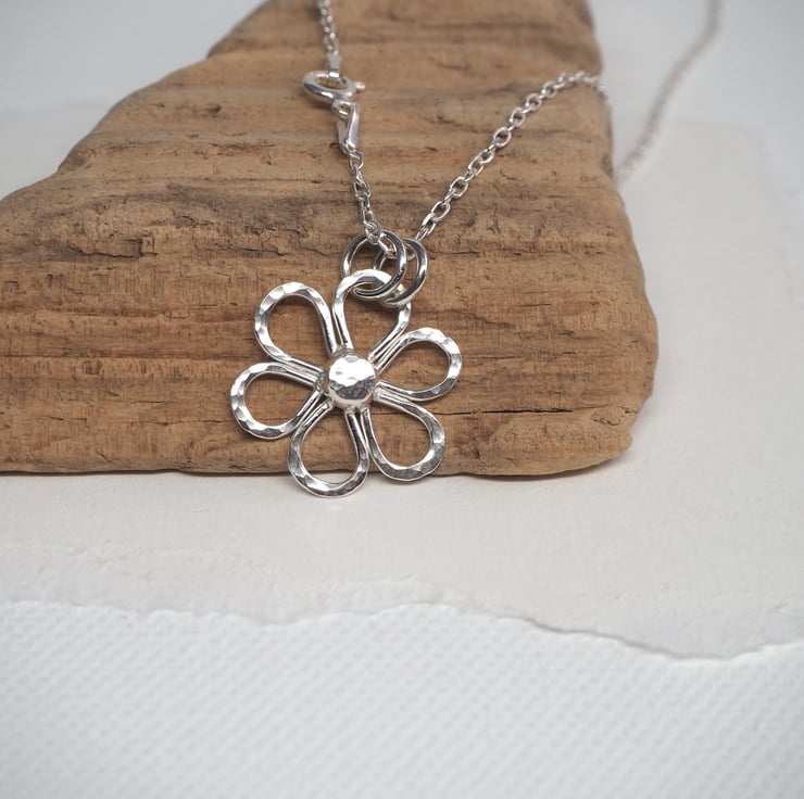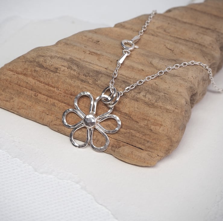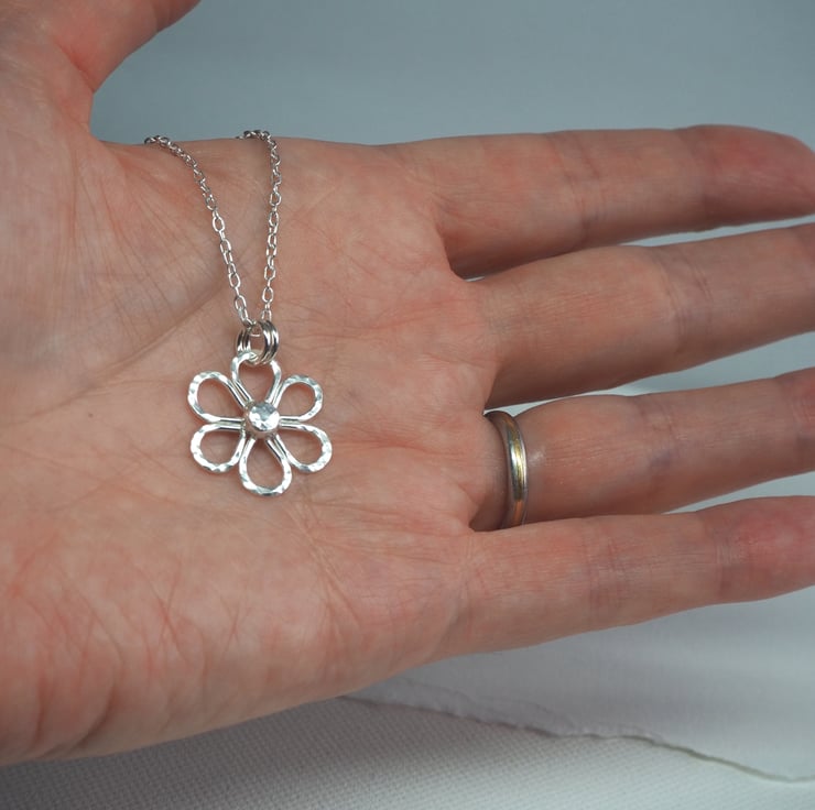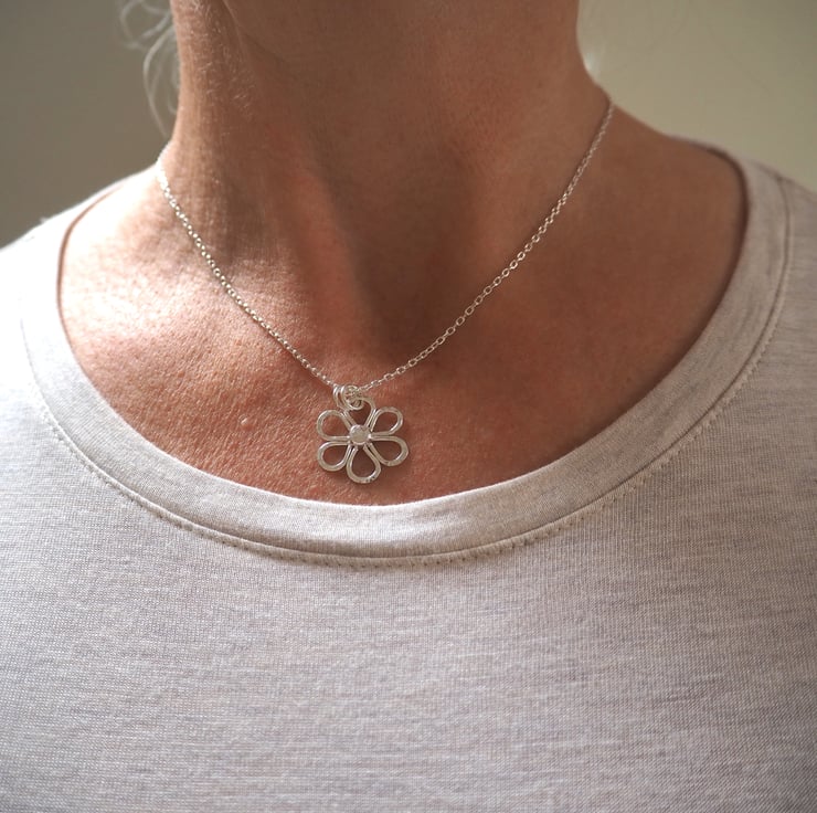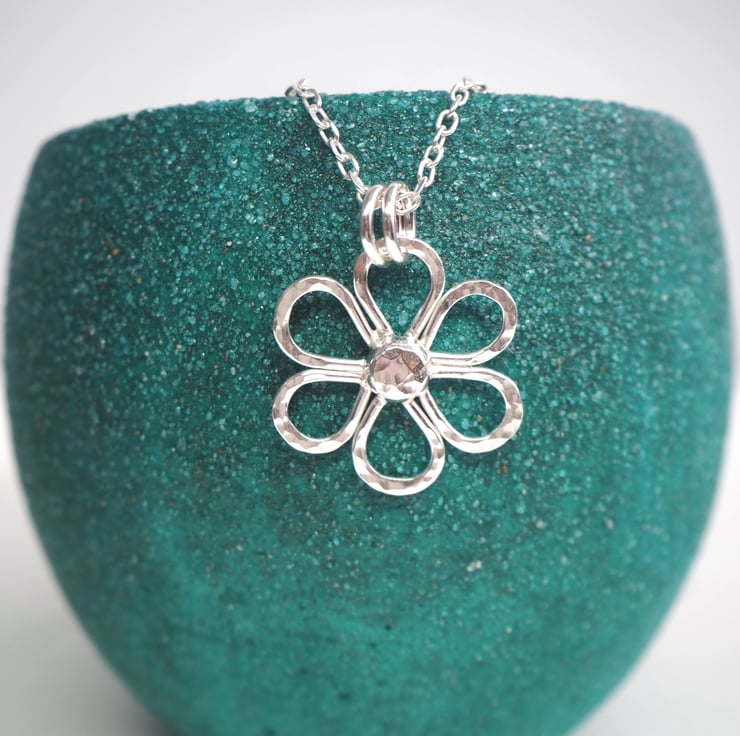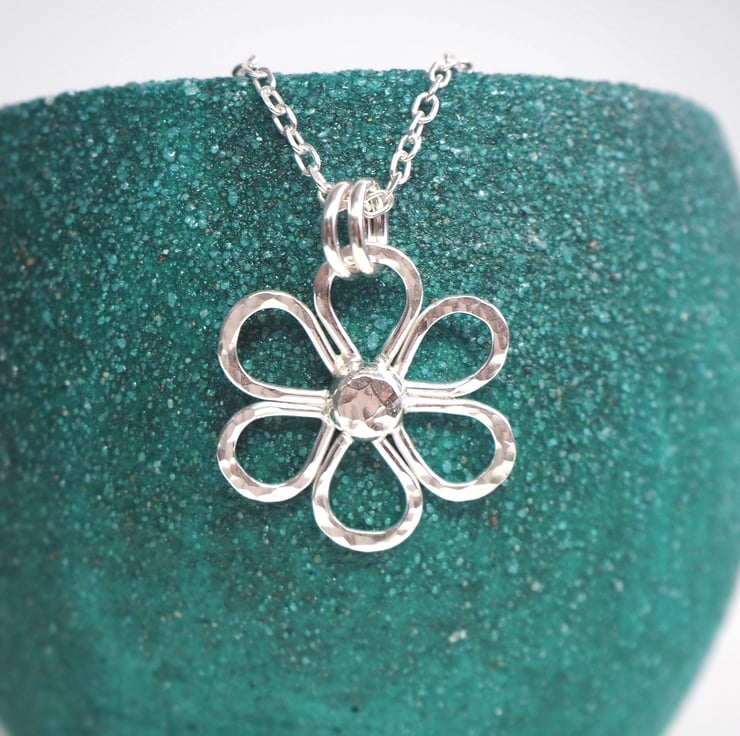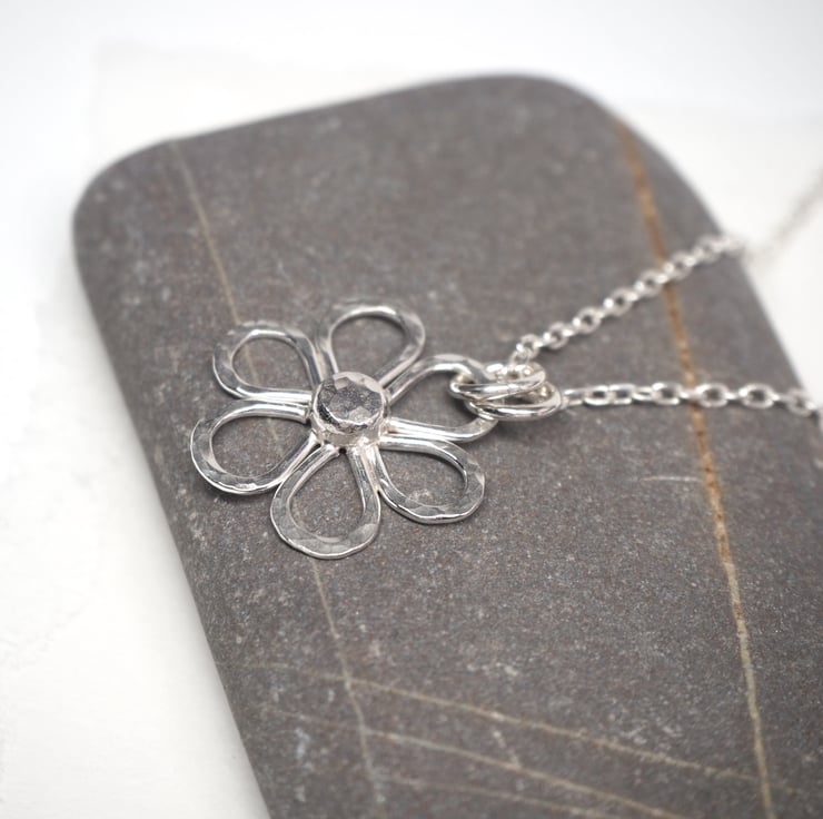 This handmade Argentium Silver 940 daisy pendant is a lovely addition to a summer outfit. The silver is recycled and has been hammered to add some sparkly texture. Polished to a bright shine to finish.