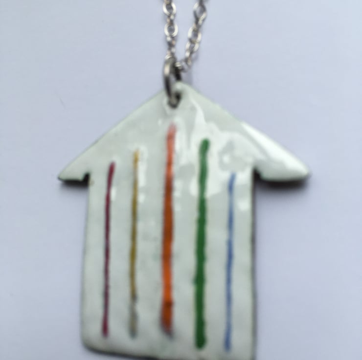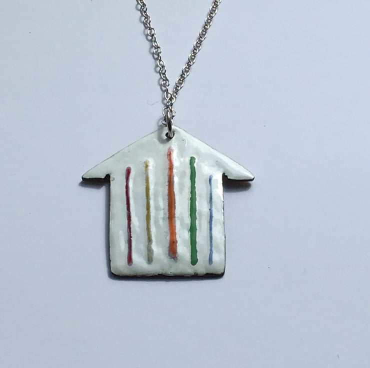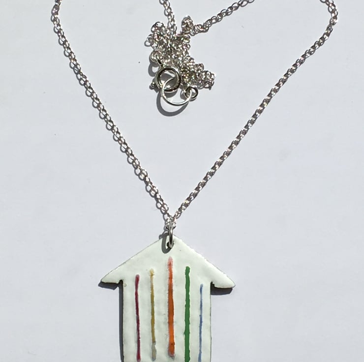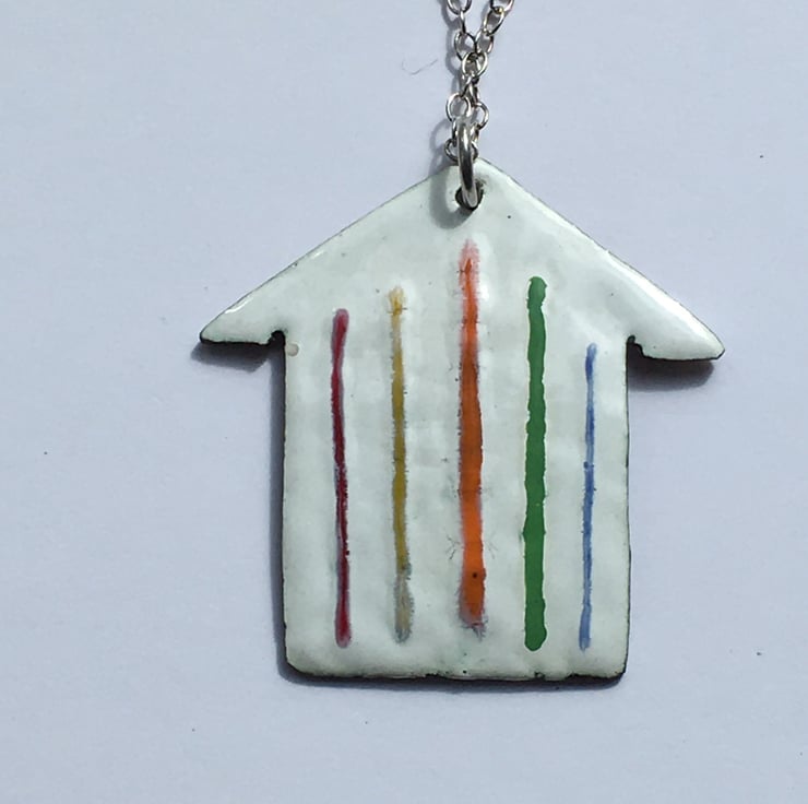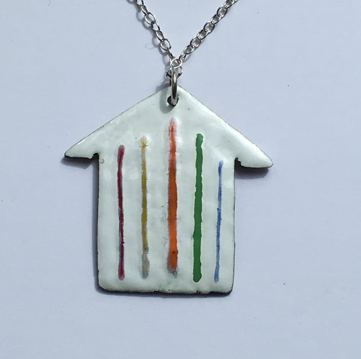 This pretty little Beach Hut Pendant has been pierced out from copper sheet and then glass enamel powder has painted between fine strands of coloured glass, creating small raised ridges of colour. After being fired it was filed with a special stone and then fired again.