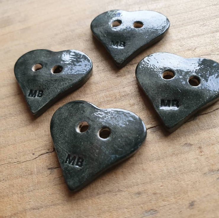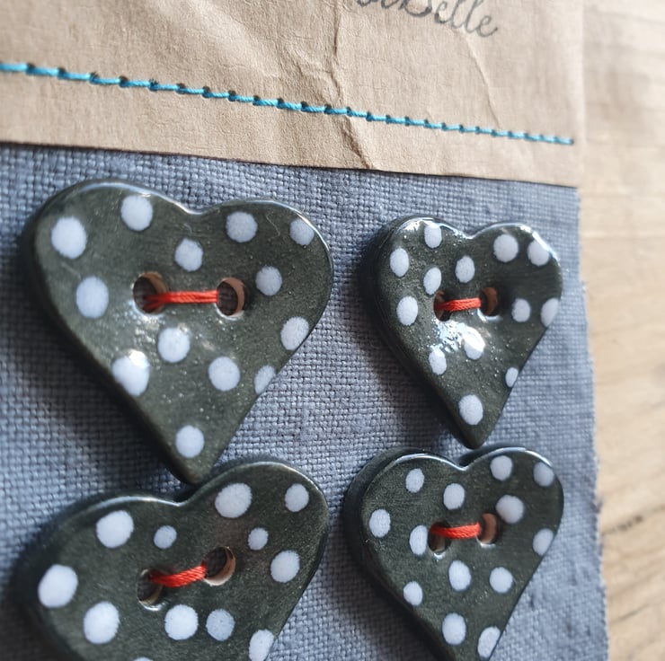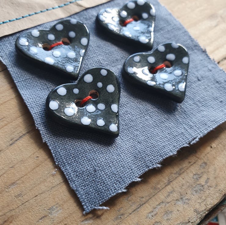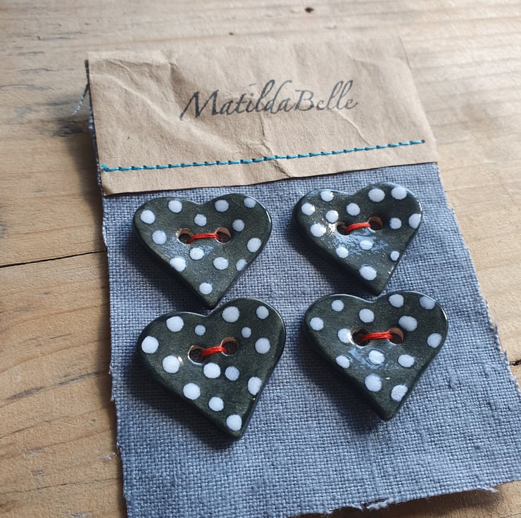 So Cute a beautiful set of Four Handmade earthenware Ceramic Buttons. Glazed on both sides in Black with white Polka Dots to the Front. The back of each button is also stamped with the MB makers mark. Each button measures approximately 2.5 x 2.5 cm.