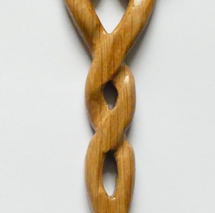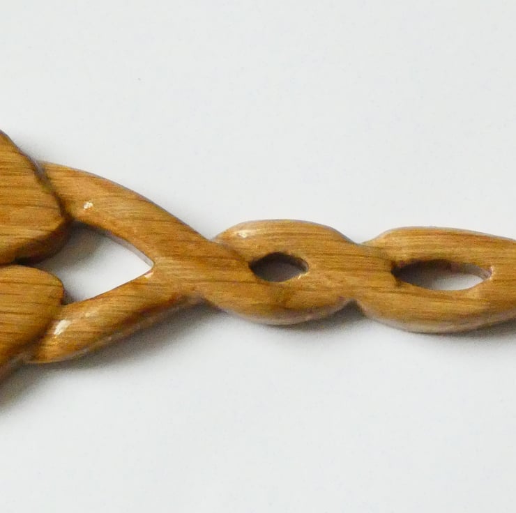 A piece of oak was selected and cut to accommodate the size of the love spoon. The love spoon was cut using a scrollsaw following a design. I then handcarved it to enhance the fine detail. Next I sanded it to a smooth finish and coated it with several coats of lacquer to protect it and highlight the beautiful grain of the wood. The lacquer used is water and heat resistant, and toy safe.