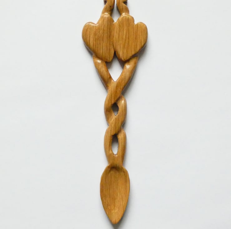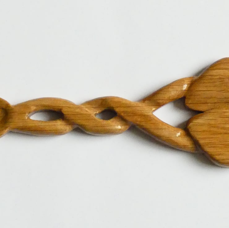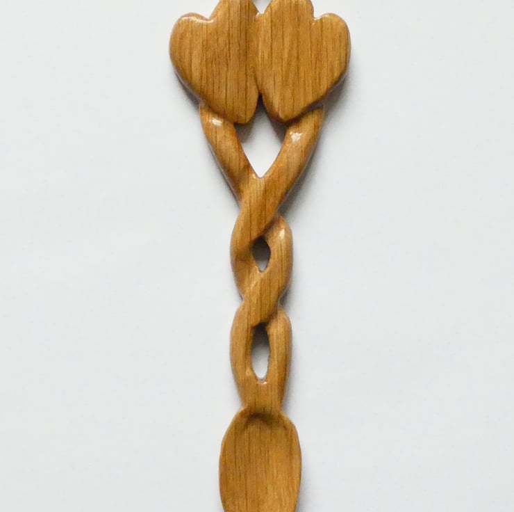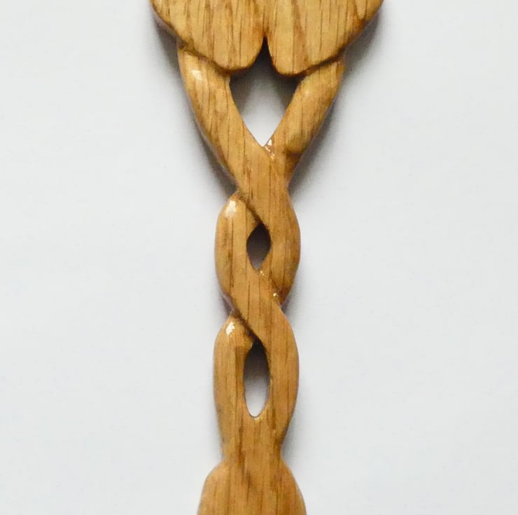Delightful carved Welsh love spoon with two hearts and celtic knotwork handcrafted from solid oak. It has been upcycled from reclaimed wood.