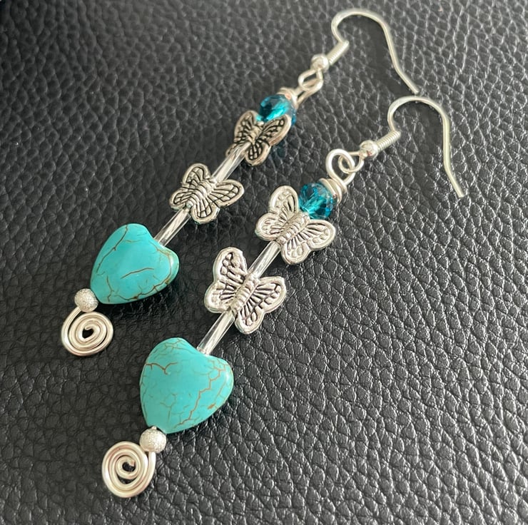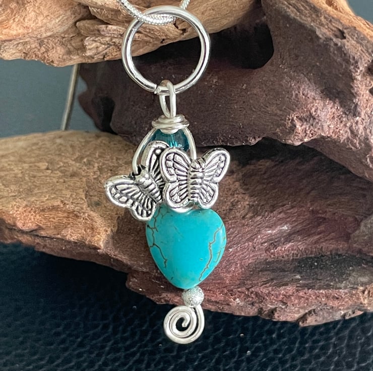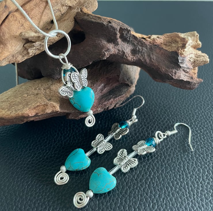Made with a wonderful selection of pressed turquoise heart beads and Tibetan silver butterfly charms, this adorable summer set was put together by hand using silver plated copper artistic wire. This wire has an ultra thin coating that will inhibit tarnishing for longer. The pendant is pared with an 18 inch black waxed cord necklace (with extender chain and lobster clasp).