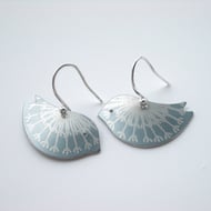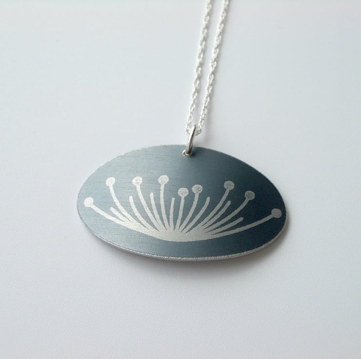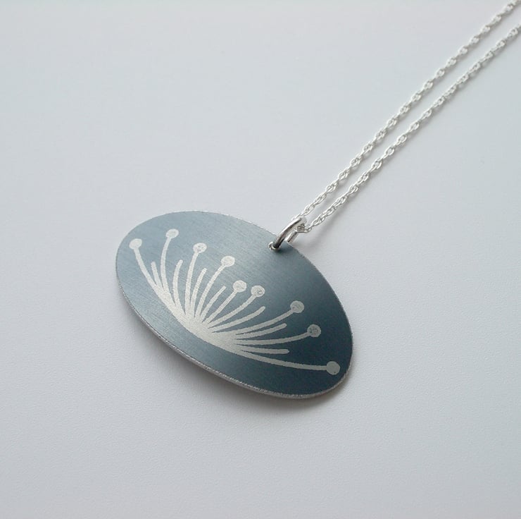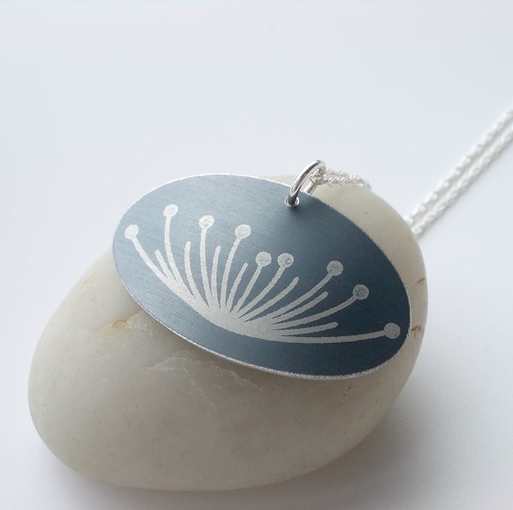 This lovely oval pendant is made from anodised aluminium which I have hand dyed in grey and printed with a silver cow parsley design. The dye is made permanent through heat and becomes sealed in to the surface of the metal. I cut out the oval shape by hand with a jeweller's saw and file the edges to give a nice smooth finish.
