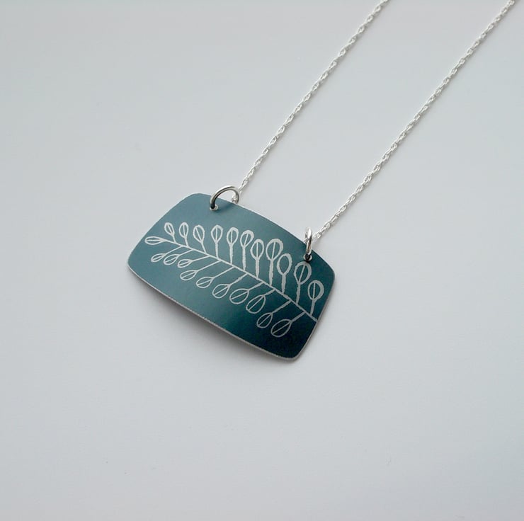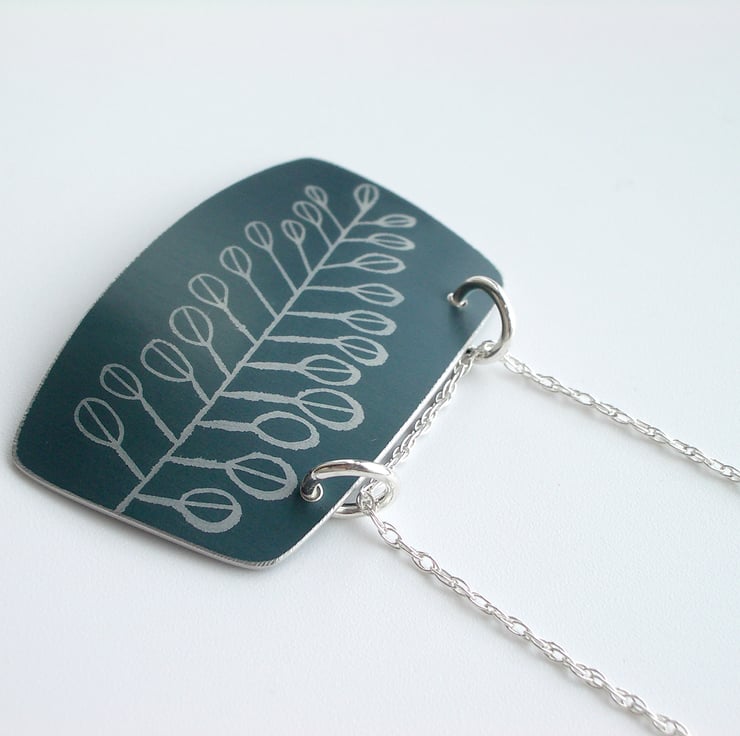 This simple pendant is made from aluminium which I have dyed in black and printed with a silver tree leaf design. I have sealed in the colour with heat which makes it become a permanent part of the metal. I saw the rectangle shape by hand using a jeweller's saw and round off the edges to give it a contemporary look. Finally, I have domed the pendant. The pendant hangs from two sterling silver jump rings which have an 18"sterling silver chain threaded through them.